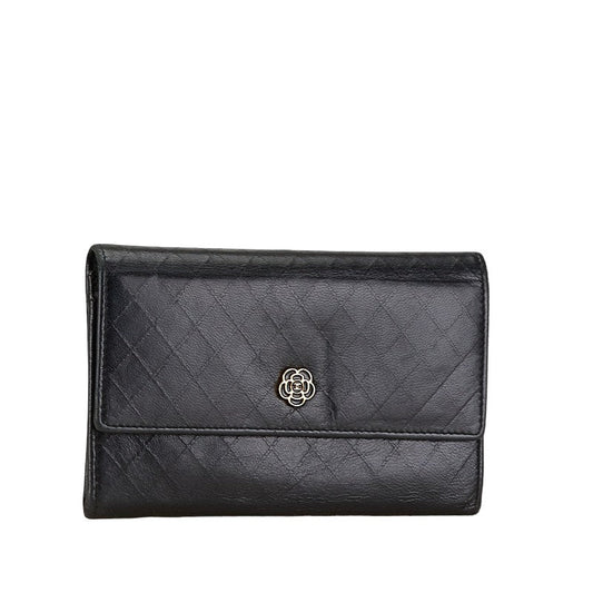 Chanel Camellia Matelasse GINZA Medium Compact Wallet Black Leather