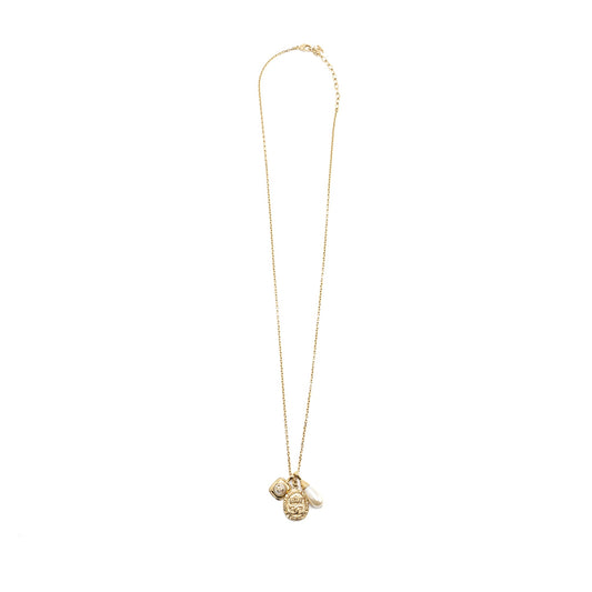 Chanel 21A Metal Plate Crystal Necklace Brushed Gold Tone