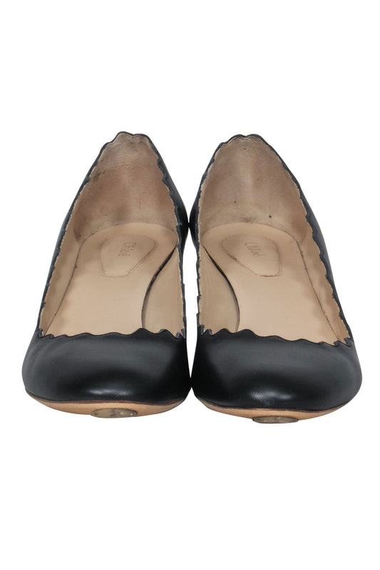 Chloe - Black Leather Scalloped Block Heel "Lauren" Pumps Sz 5.5
