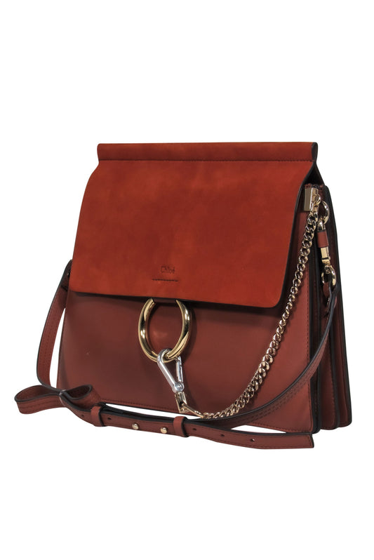 Chloe - Brown Leather & Suede Fold-Over "Faye" Shoulder Bag w/ Ring Hardware