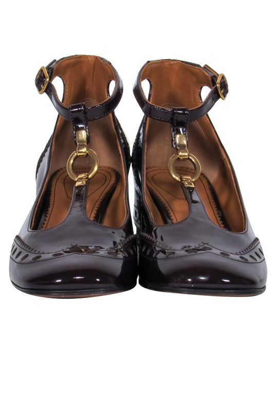 Chloe - Maroon Patent T-Strap Mary Jane Pumps w/ Loafer Embroidery Sz 8