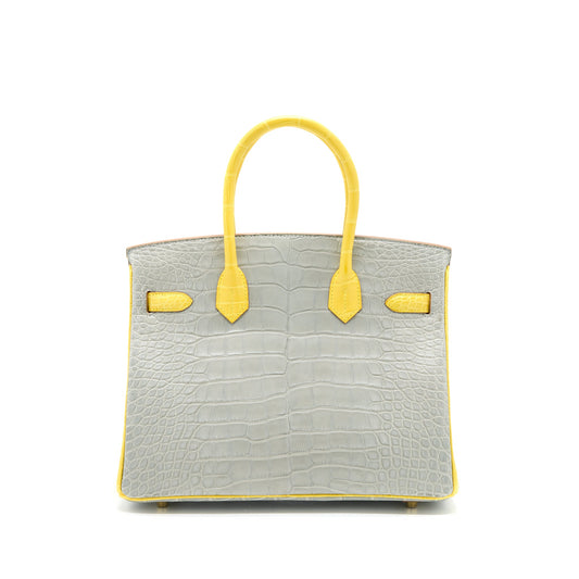 Hermes Birkin 30 Special Order Alligator Mississippiensis Mat Gris Perle/Mimosa LGHW Stamp D