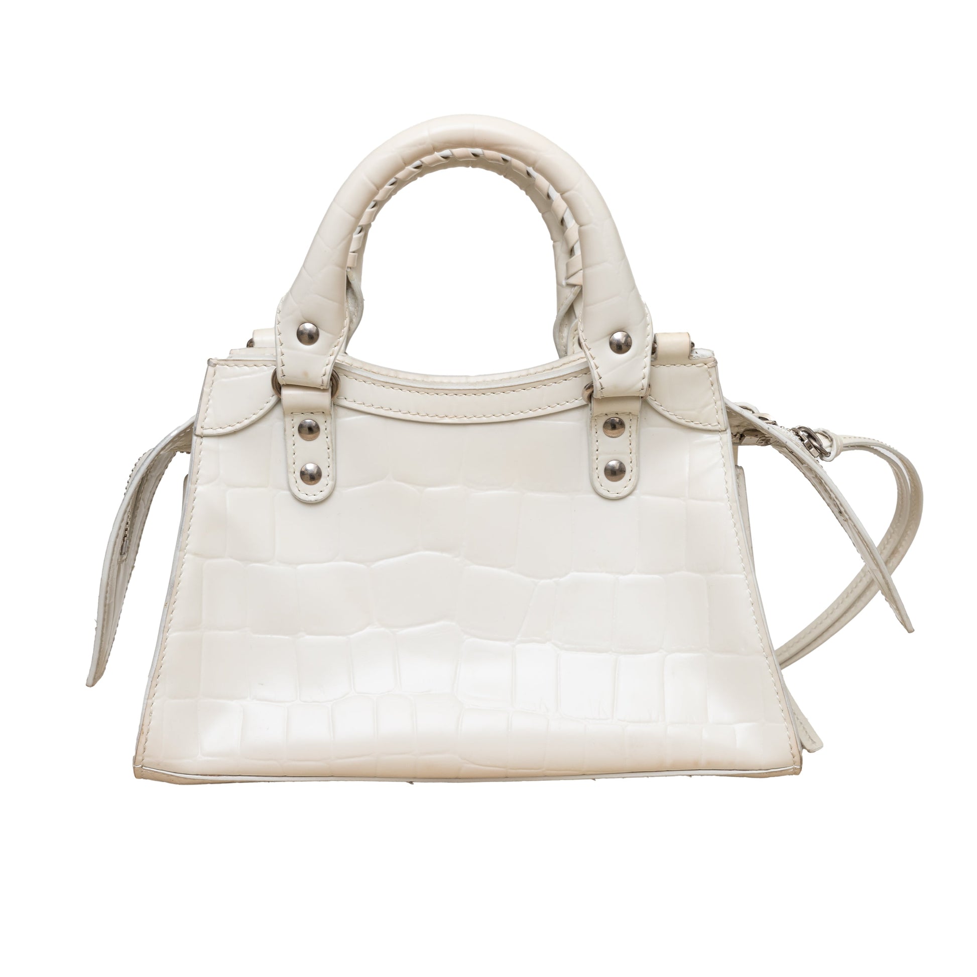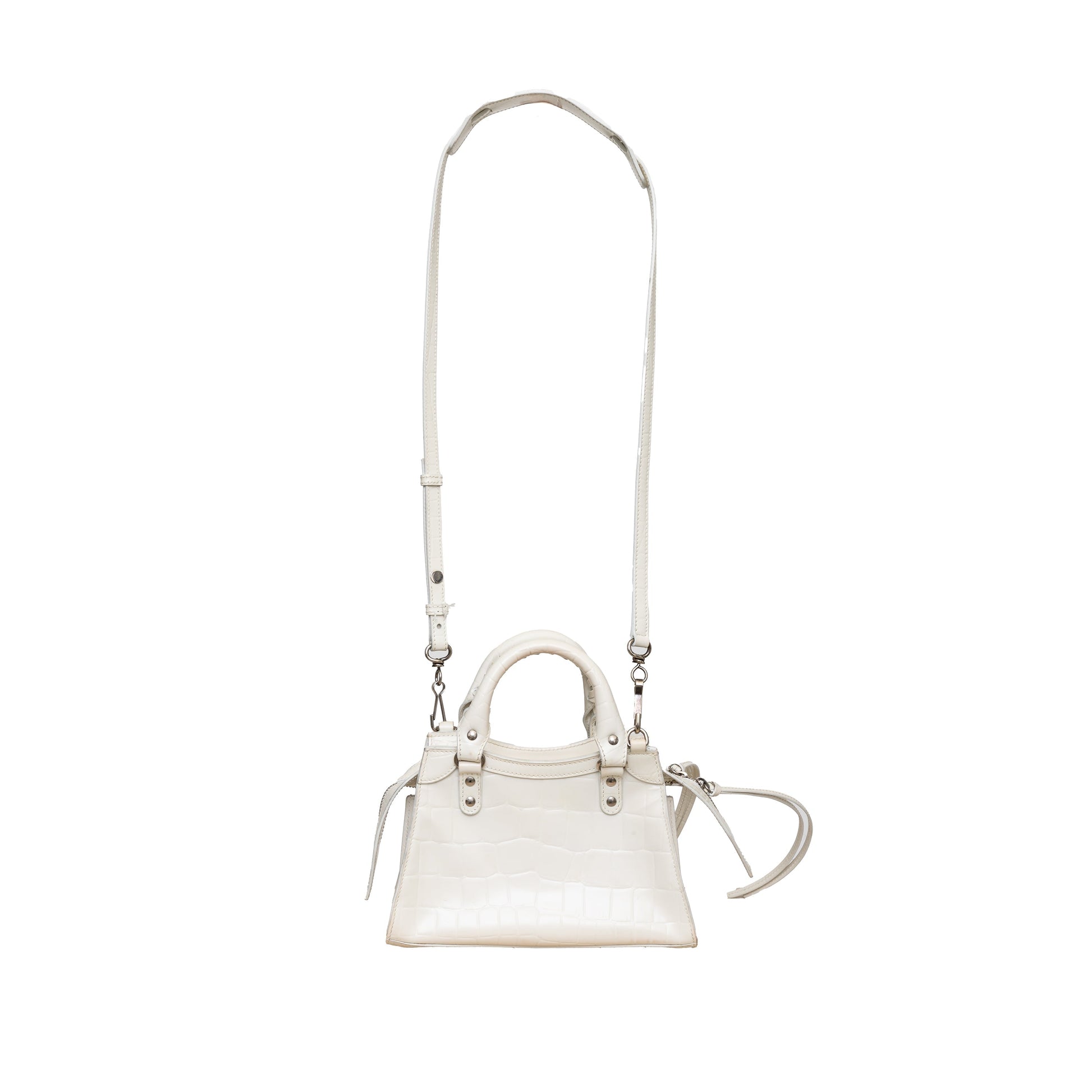 The Balenciaga Neo Classic mini top handle bag remains a classic and crowd favourite! Made in Italy with white leather and embossed crocodile leather effect, this sturdy bag features silver-tone hardware and can be carried by the top handles or with the detachable shoulder strap.Β Inclusion: Dust bag, shoulder strap.