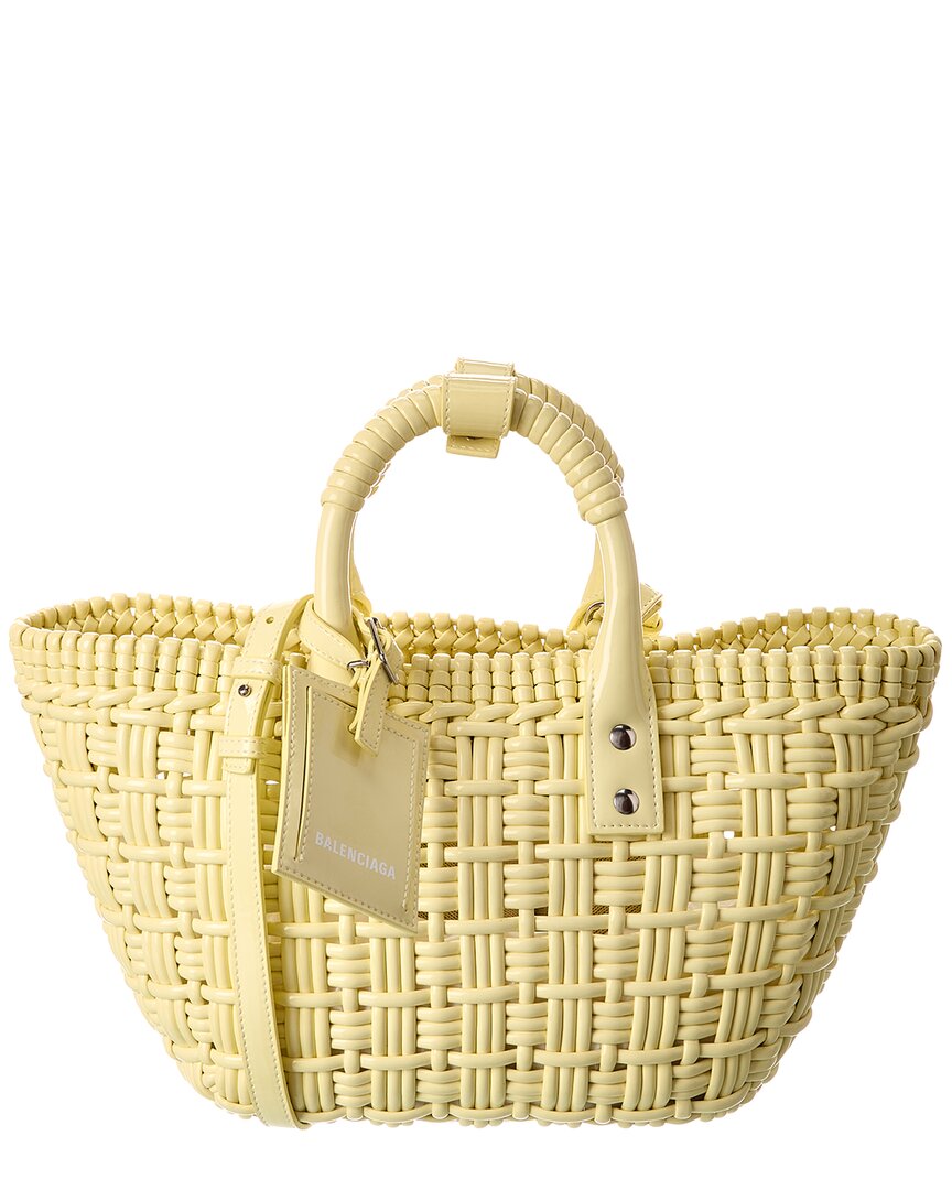 Elevate your style with the Balenciaga Bistro XS Basket Tote, a luxurious handbag that exudes sophistication and modernity. Crafted in Italy from yellow woven faux leather and finished with palladium metal hardware, this tote is a true statement piece. The interior features a zippered pocket for convenient storage, while the open top allows for easy access to your essentials. The top handles have a 5-inch drop, and the removable shoulder strap has a drop of 17.7 inches, giving you versatile carrying options. Add a touch of high-fashion to your look with this iconic Balenciaga tote.