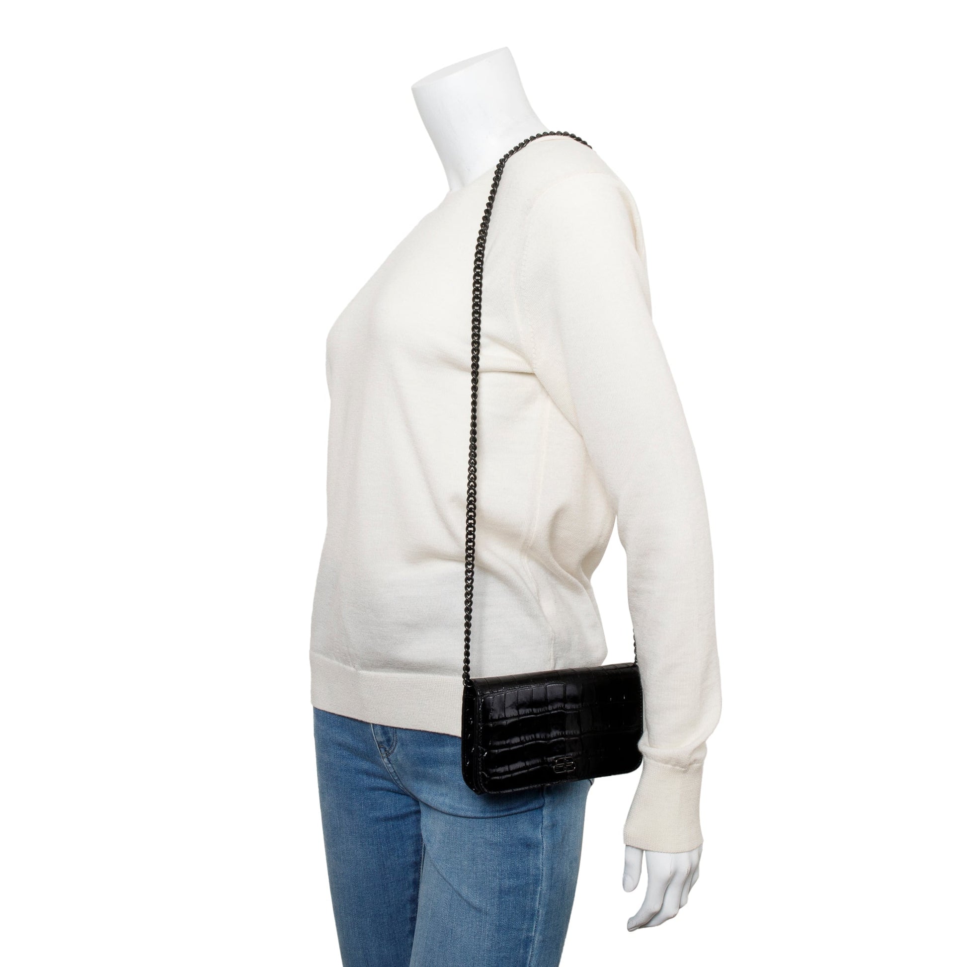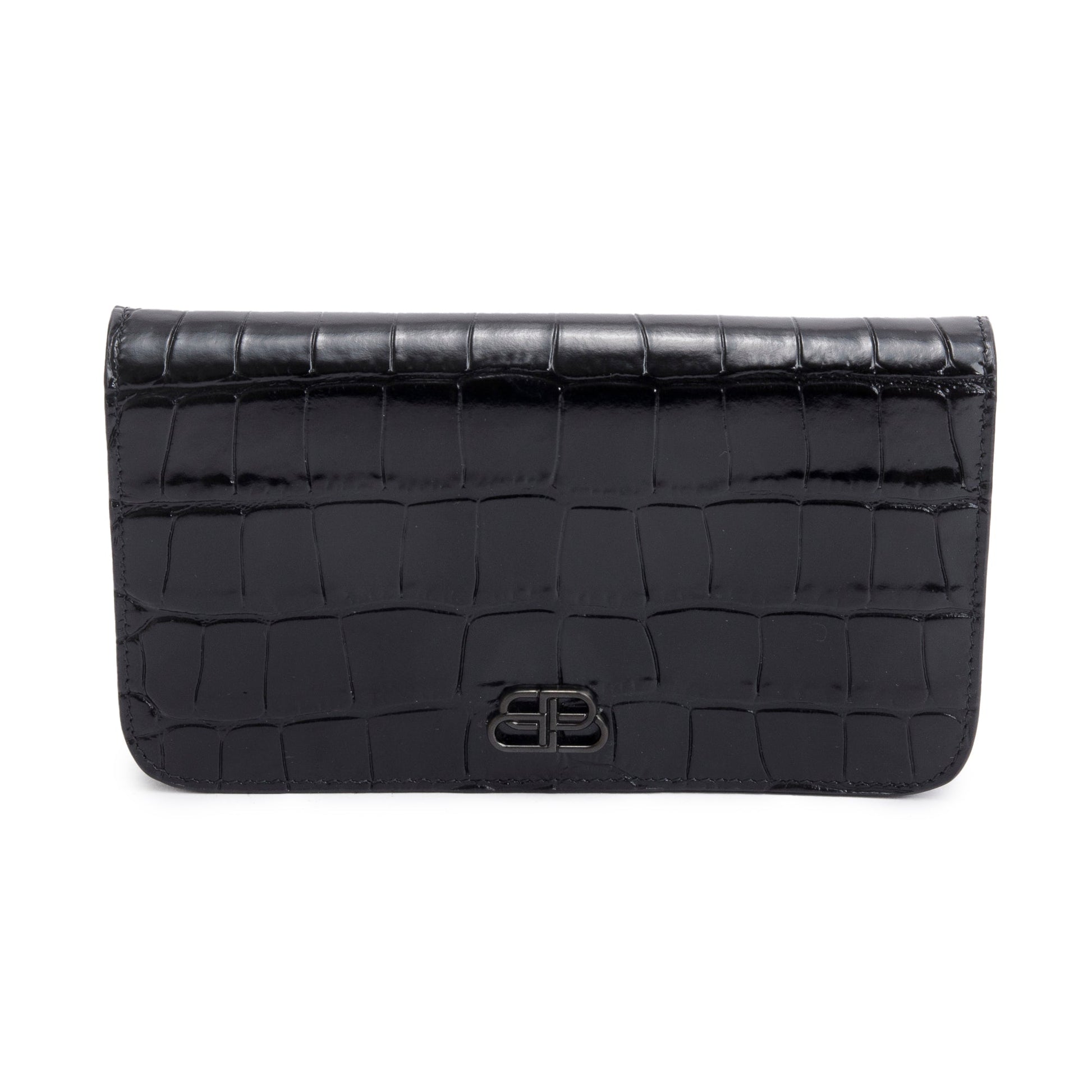 Balenciaga Black Croc-Embossed Leather Phone Holder Wallet on Chain w/ Box