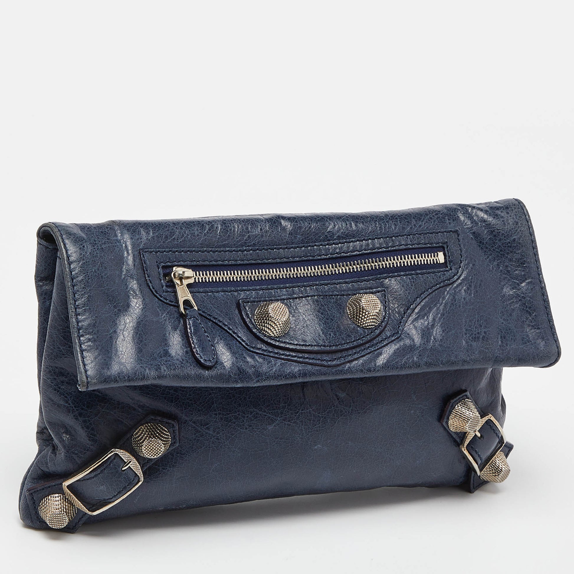 Revolutionary and visionary designs set Balenciaga apart from others, and this blue creation testifies to it. The exterior of this Balenciaga clutch is updated with chic and striking silver tone accents. Crafted from leather, it is equipped with a front zipper pocket on the folded top, and the fabric lined interior is perfectly sized to dutifully hold your essentials.