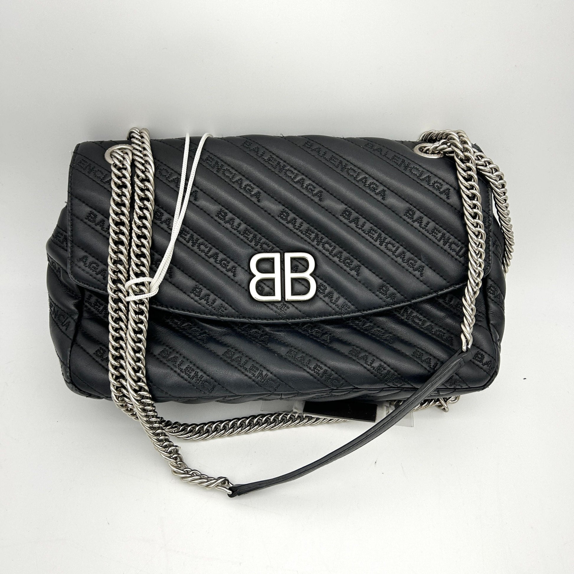 BALENCIAGA Calfskin Logo Matelasse S BB Round Shoulder Bag Black LA43555