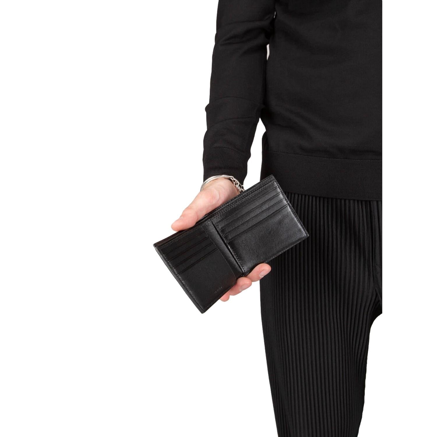This bifold wallet is crafted of pebbled black calfskin leather with a white Balenciaga logo on the front face. The interior is made with the same black calfskin leather and features eight card slots, 2 bill slots, and 2 slip pockets. The sleek and functional design of this wallet make it ideal for daily use.