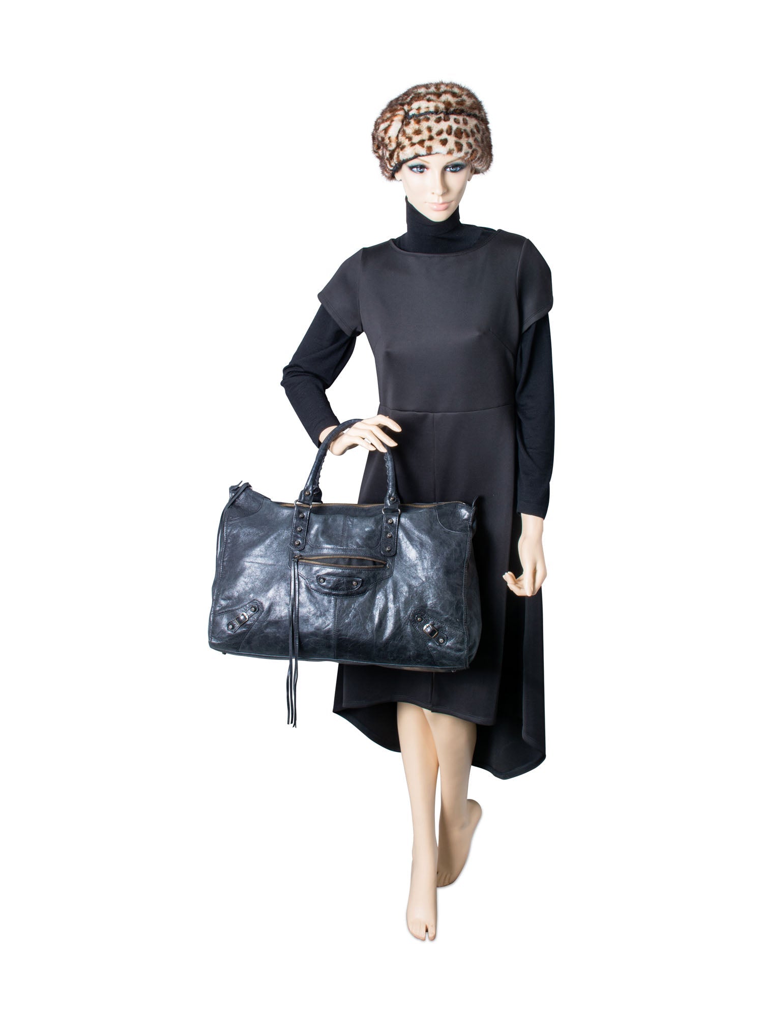 Balenciaga Vintage City Bag or . This tote is crafted in distressed black lambskin leather with brass tone hardware. The bag features hand-stitched rolled leather top handles, a frontal zipper pocket, leather belts and patches, and black buckles and studs. The top zipper opens to a black fabric interior with a zippered pocket.