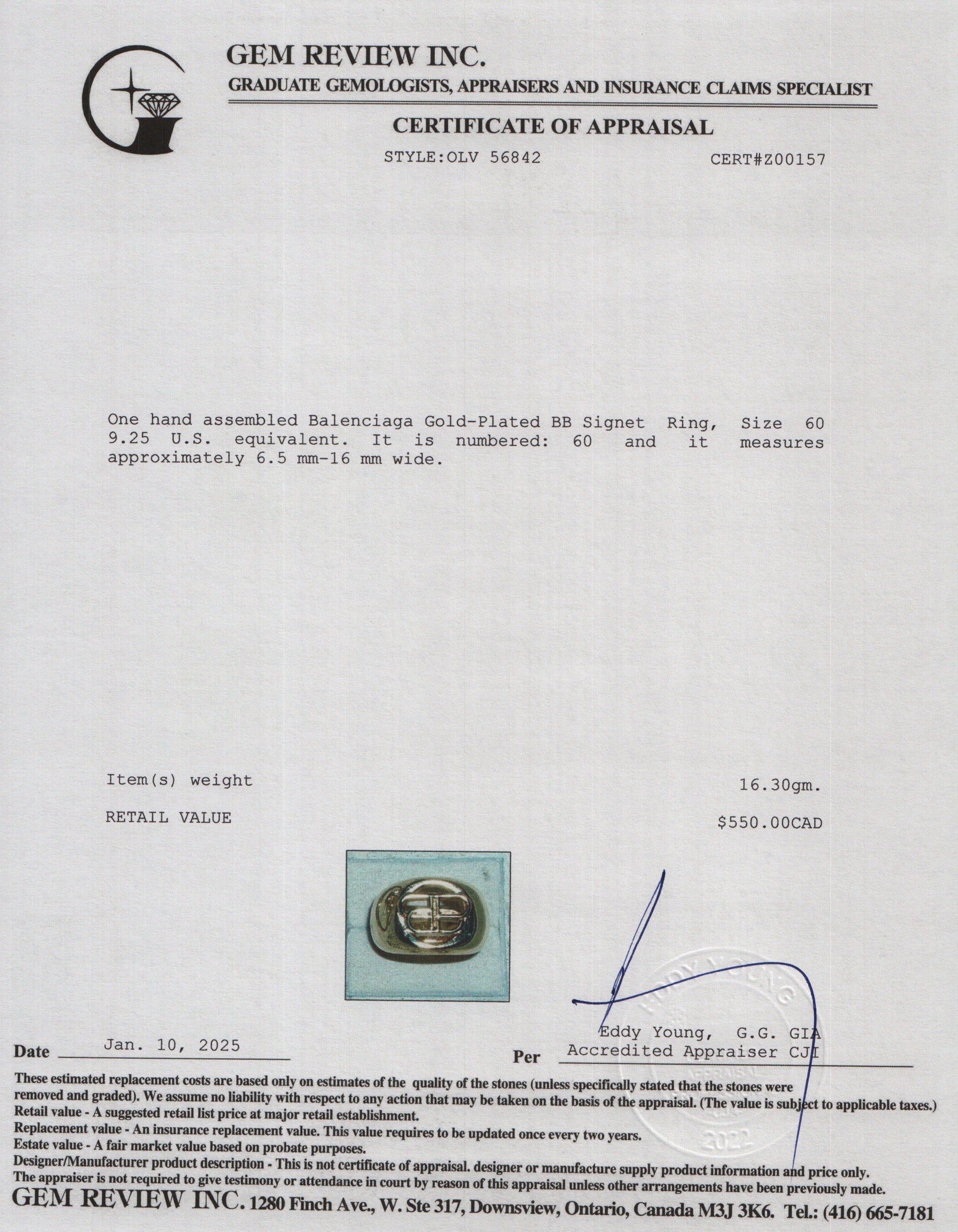 Balenciaga Gold-Plated BB Signet Ring, Size 60 9.25