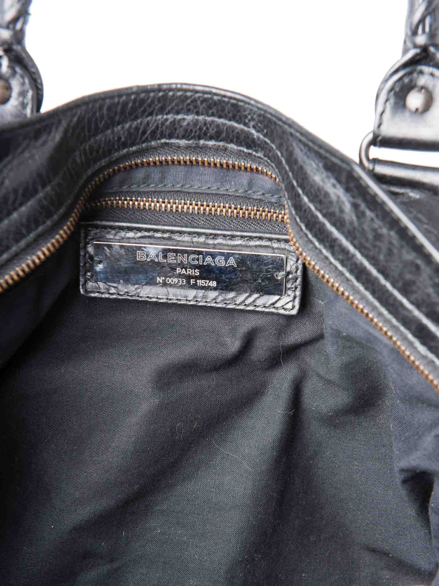 Balenciaga Vintage City Bag or . This tote is crafted in distressed black lambskin leather with brass tone hardware. The bag features hand-stitched rolled leather top handles, a frontal zipper pocket, leather belts and patches, and black buckles and studs. The top zipper opens to a black fabric interior with a zippered pocket.