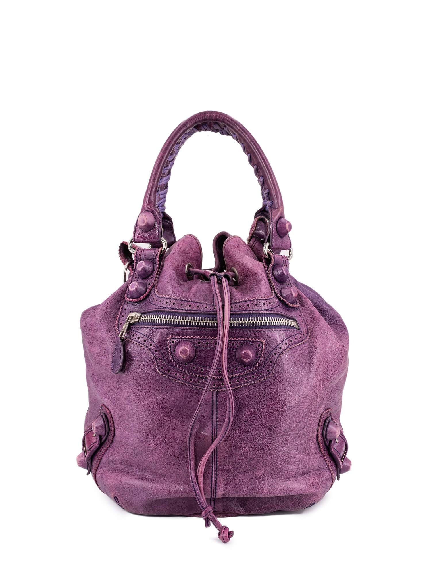 Balenciaga Large Pompon Bucket Bag or . This bucket bag is in distressed purple calfskin leather with silver hardware. It features handwoven leather top handles, an optional leather shoulder strap with shoulder guard, one exterior zipped pocket, attached Balenciaga Leather covered mirror and a leather cinch cord closure. This bucket style bag also features the iconic Balenciaga detailing of belts and buckles. The top opens to a compact black fabric interior with a single zippered pocket.