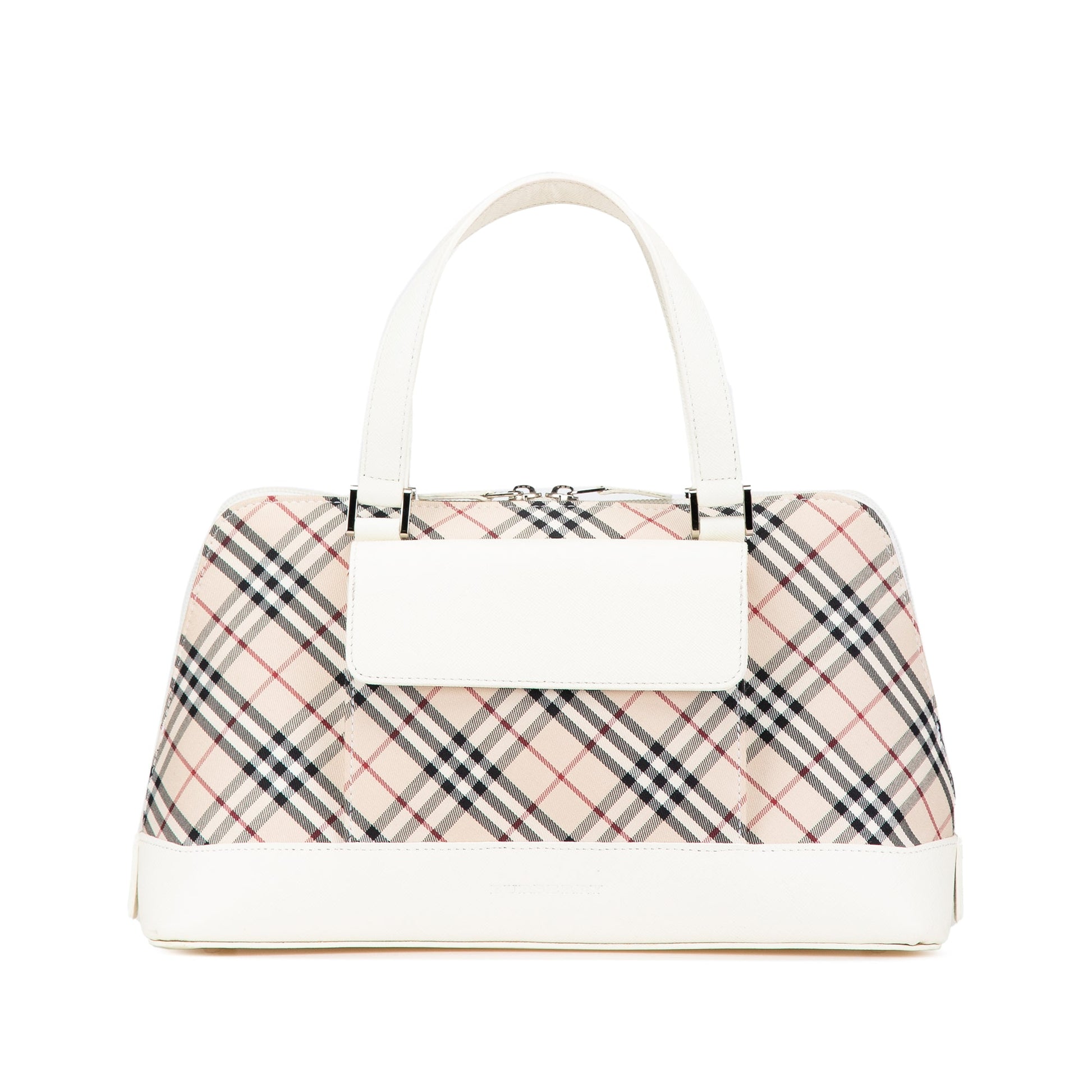 Product Details: Beige Burberry Nova Check Canvas Handbag. This handbag features a nova check canvas body with leather trim, flat leather handles, a top zip closure, an exterior front flap pocket, and interior zip and slip pockets. 7.5" L x 12.6" W x 5.1" D, 5.5" drop.