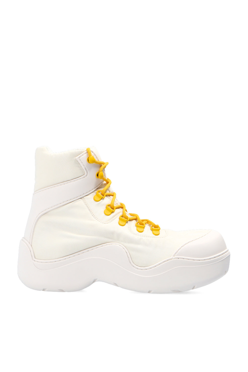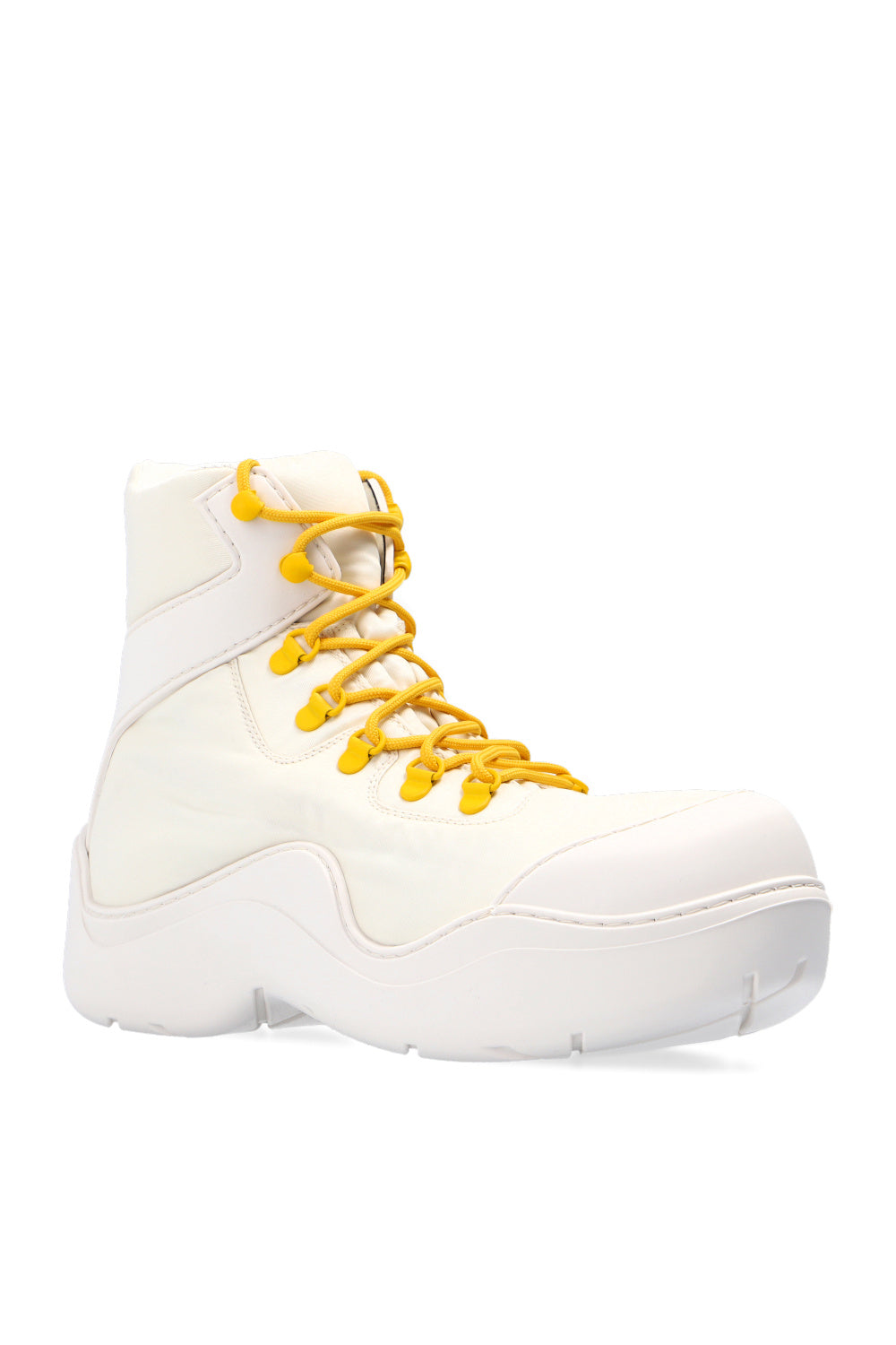 New Bottega Veneta Cream ‘Puddle Bomber’ ankle boots from Bottega Veneta. Resting on a white rubber sole, this lace-up pair features rubber trims and yellow laces.