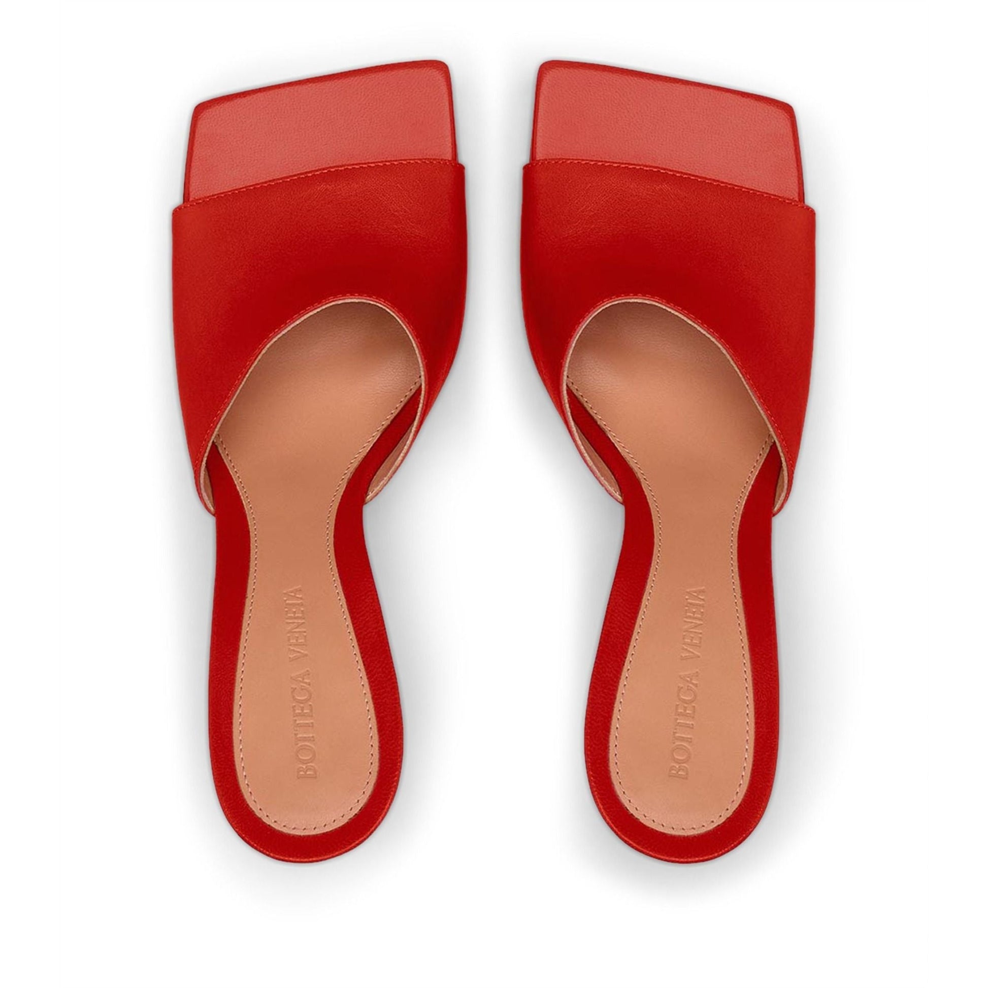 The Bottega Veneta Stretch Heeled Mule is crafted from vibrant red calfskin and features a sleek stiletto heel. This mule combines a bold color with a sophisticated design, reflecting the brand's dedication to luxury and contemporary style.
