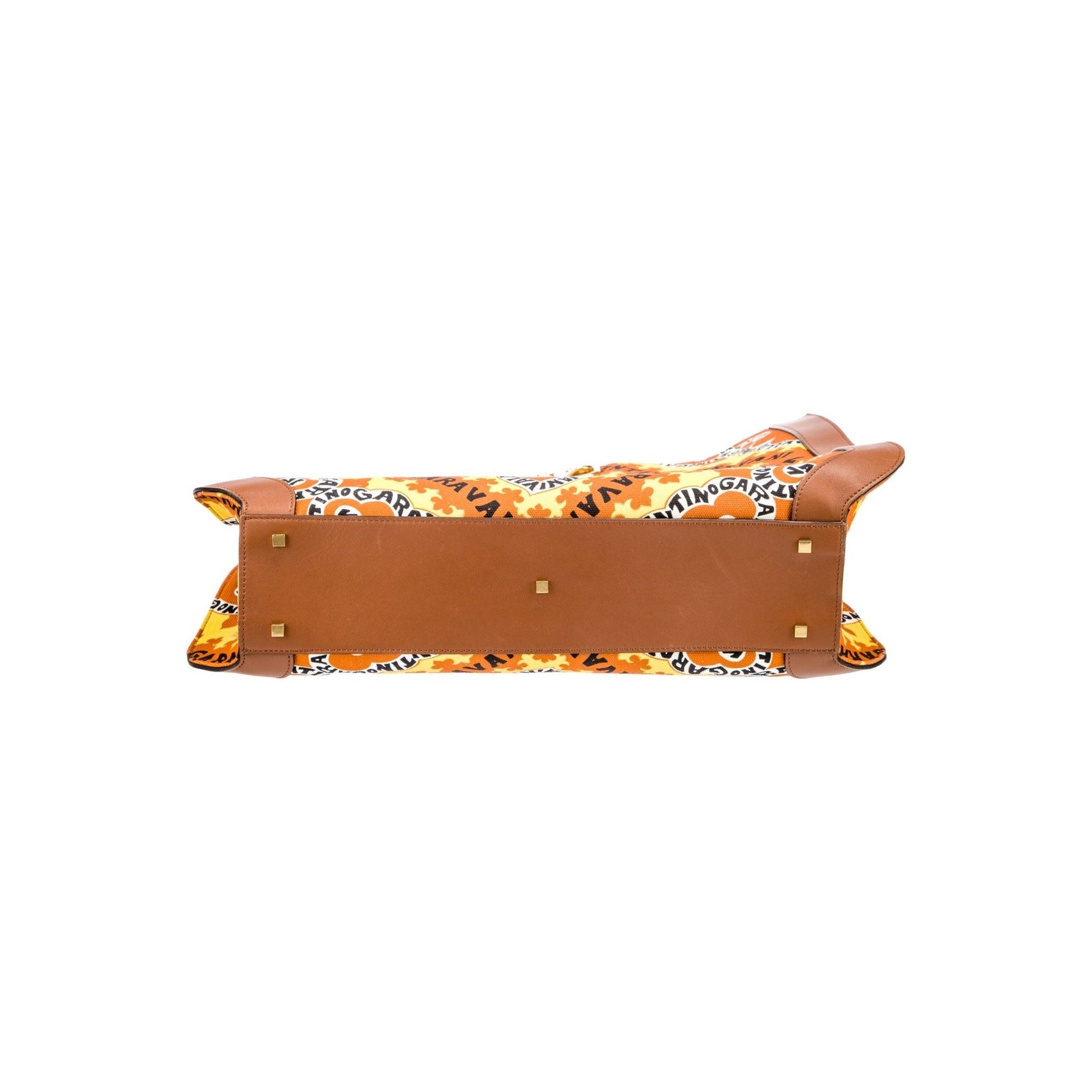 The Valentino Garavani V'Logo Tote Bag is a top-handle bag that features a striking graphic design. It is adorned with gold-tone studs and includes a slip pocket and an open compartment. The bag is completed with an open top for easy access.