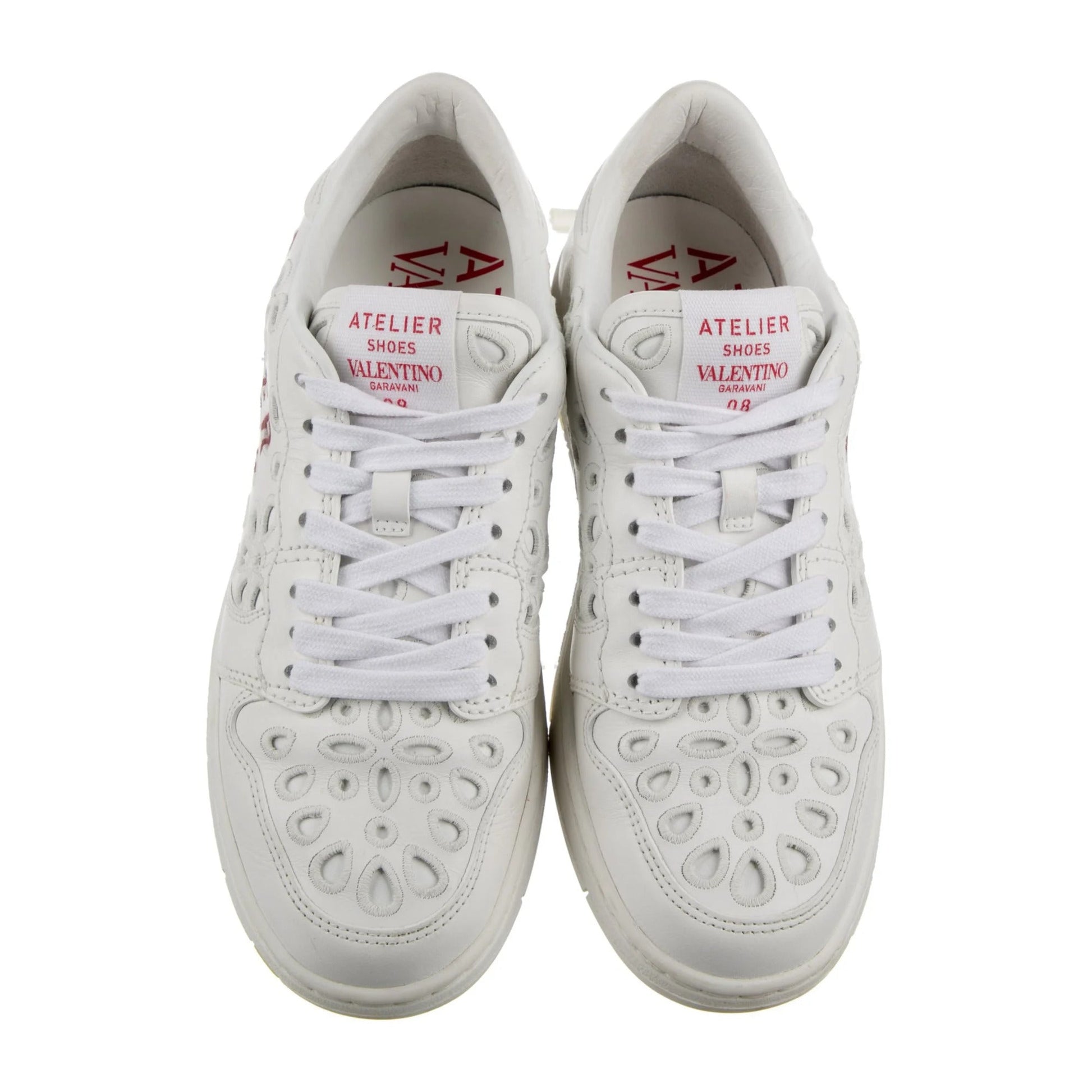 The Valentino Garavani Leather Graphic Print Sneakers in white and red are crafted from premium calf leather, offering a luxurious feel and durability. These sneakers feature an eye-catching graphic print, adding a bold and contemporary touch to the design. The intricate embroidery further enhances the sneakers' aesthetic, showcasing the brand's attention to detail and craftsmanship. The combination of classic white leather with vibrant red accents creates a striking contrast, making these sneakers a standout addition to any footwear collection.