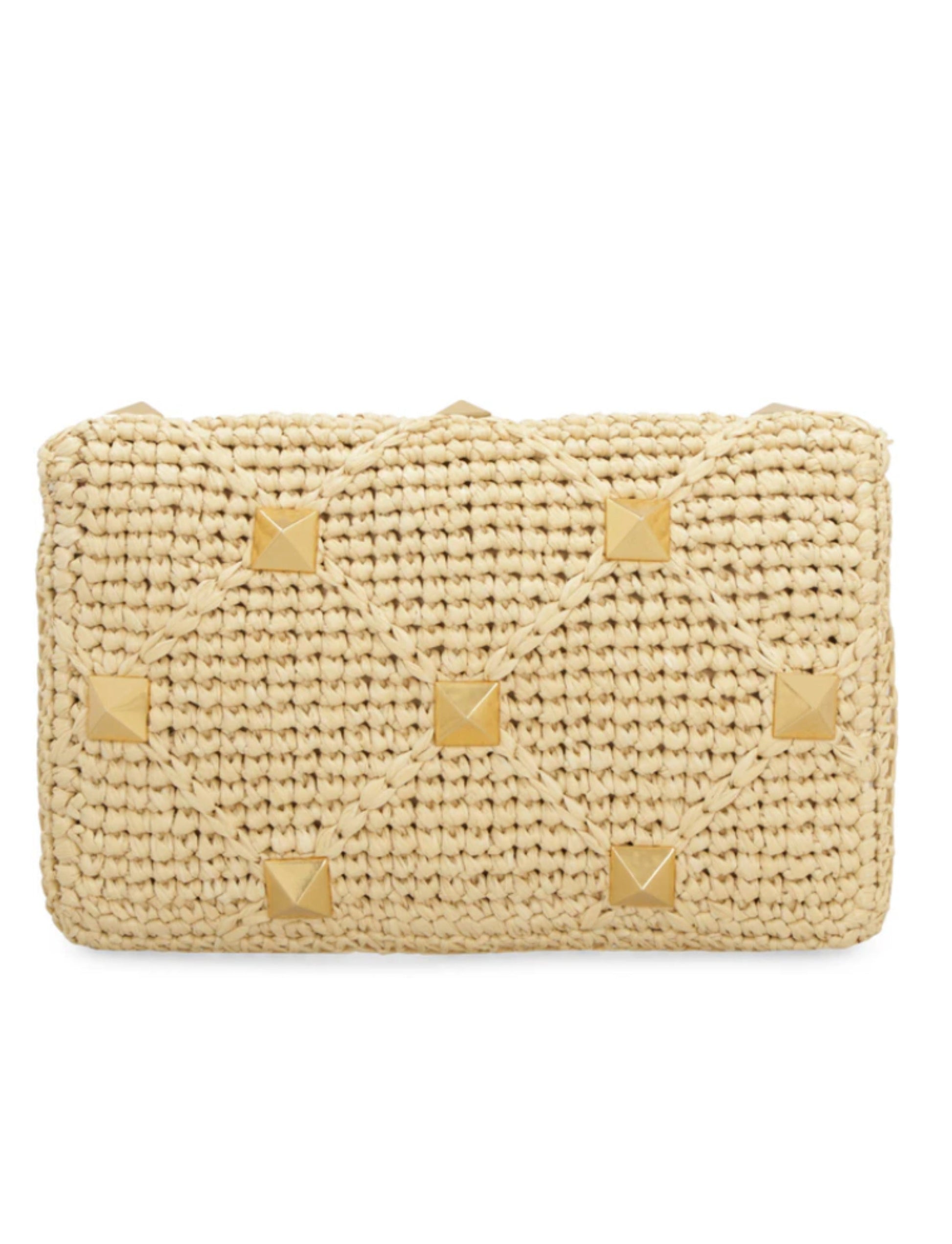 The Valentino Garavani Roman Stud Small Pouch is an embellished accessory featuring a studded Fair Isle design. It includes a slip pocket for organization and is finished with gold-tone hardware. The pouch is secured with a turnlock closure.