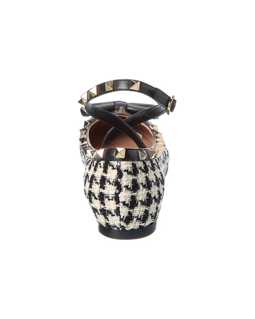 - Rockstud Tweed & Leather Flat In Black And White Tweed And Leather With Platinum-Finish Rockstuds And Padded Bow Accent