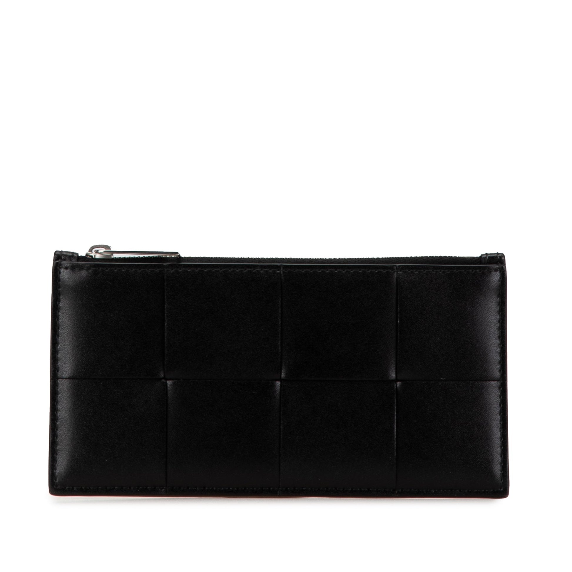 Product Details: Black Bottega Veneta Intreccio Slim Cassette Zip Card Holder. This card holder features a woven leather body, a top zip closure, and exterior slip pockets. 3.1" L x 6.3" W x 0.2" D. Serial number P026667L.