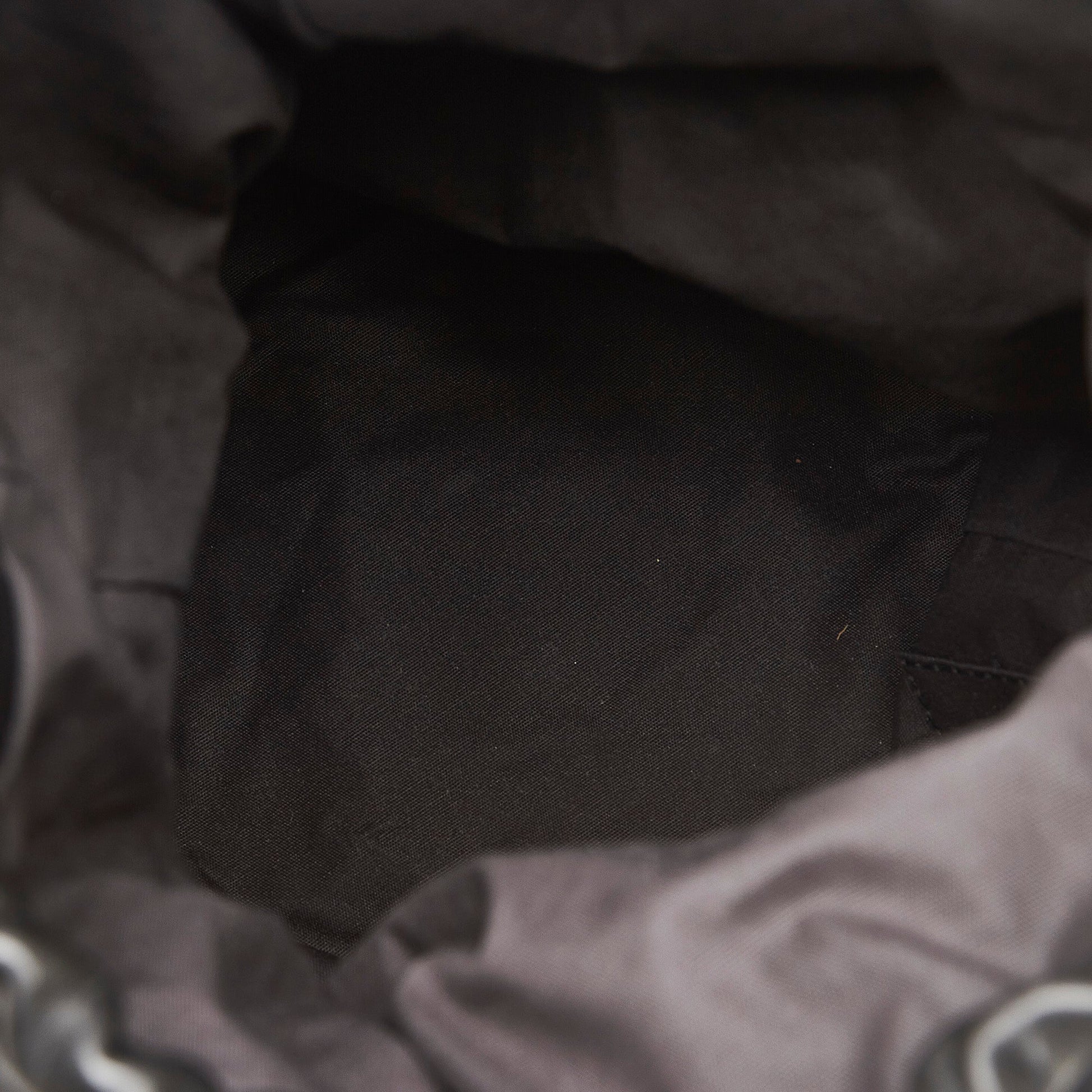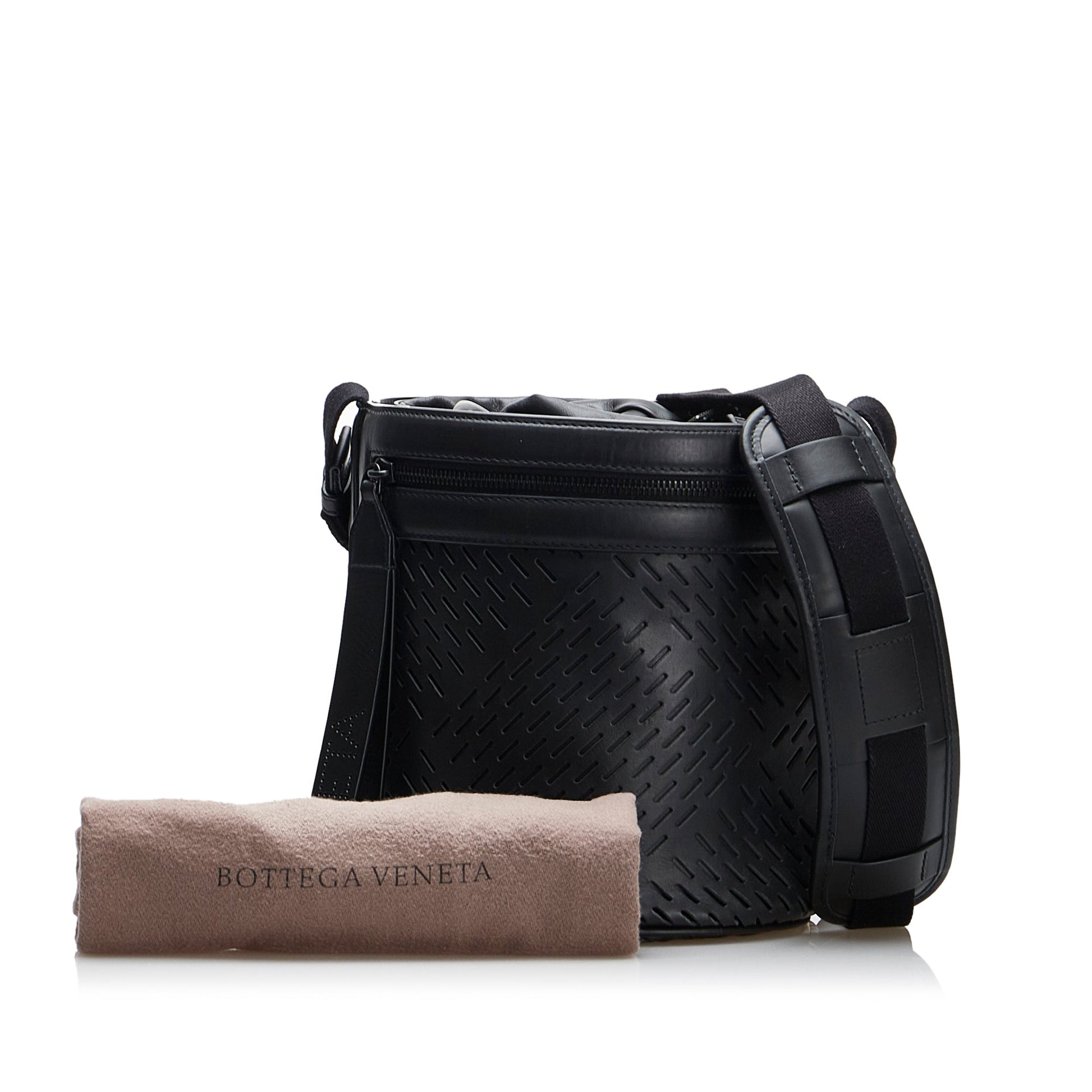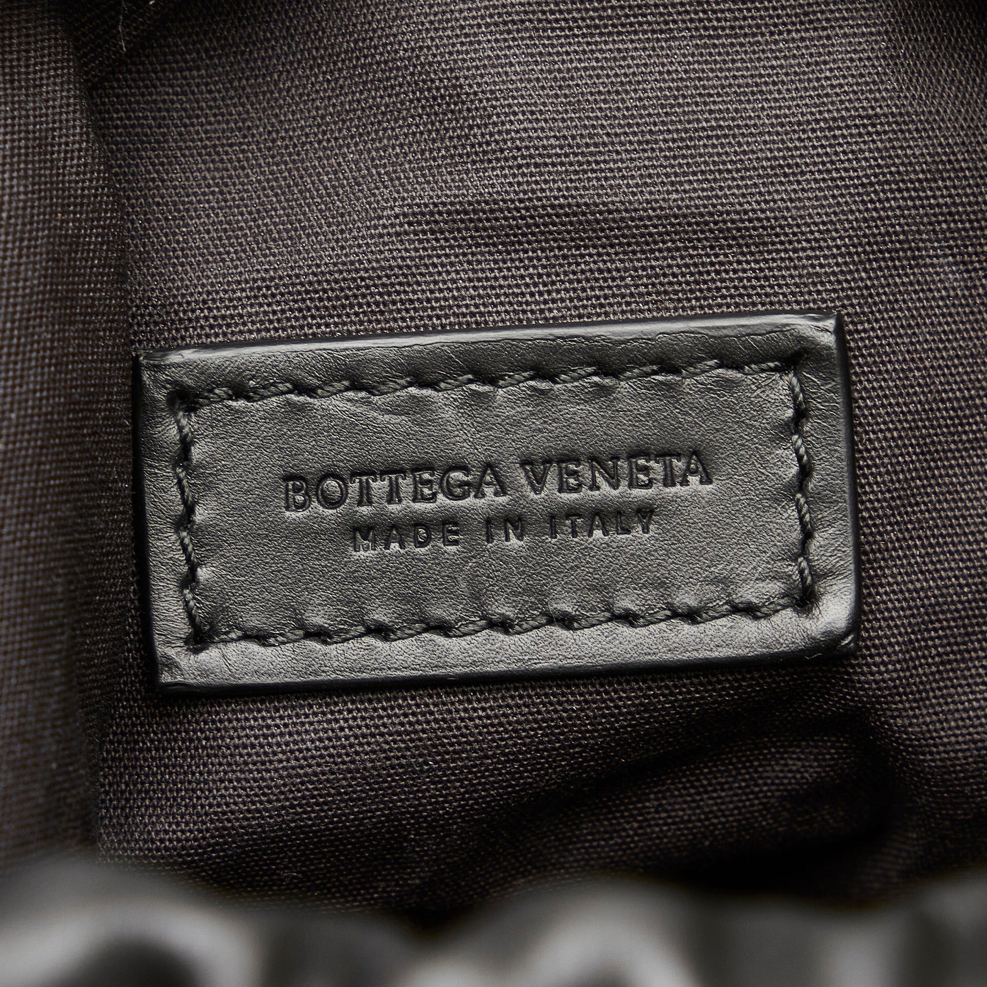 Product Details: Black Bottega Veneta Perforated Leather Paper Bucket Bag. The Paper Bucket bag features a perforated leather body, an adjustable flat nylon and leather shoulder strap, an open top, a removable pouch with magnetic snaps and a top drawstring closure, and an exterior front zip pocket. 8.3" L x 7.5" W x 7.5" D. Serial number B07957882A.