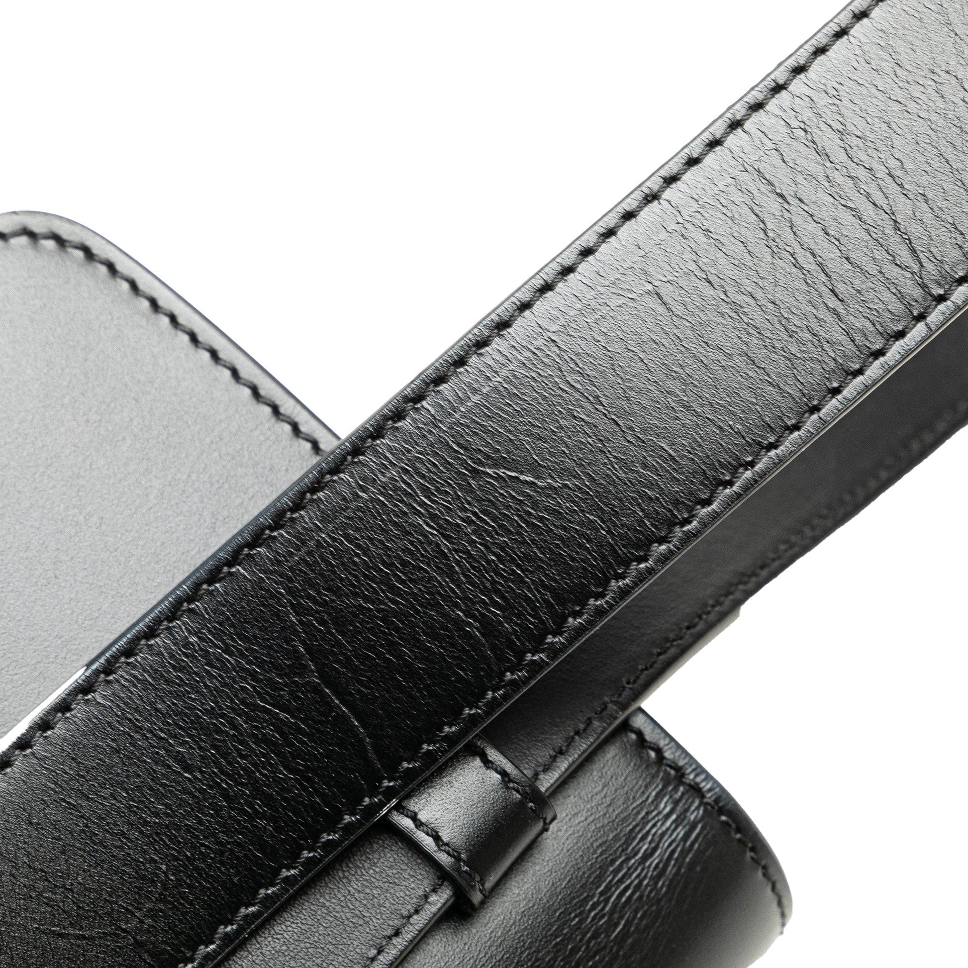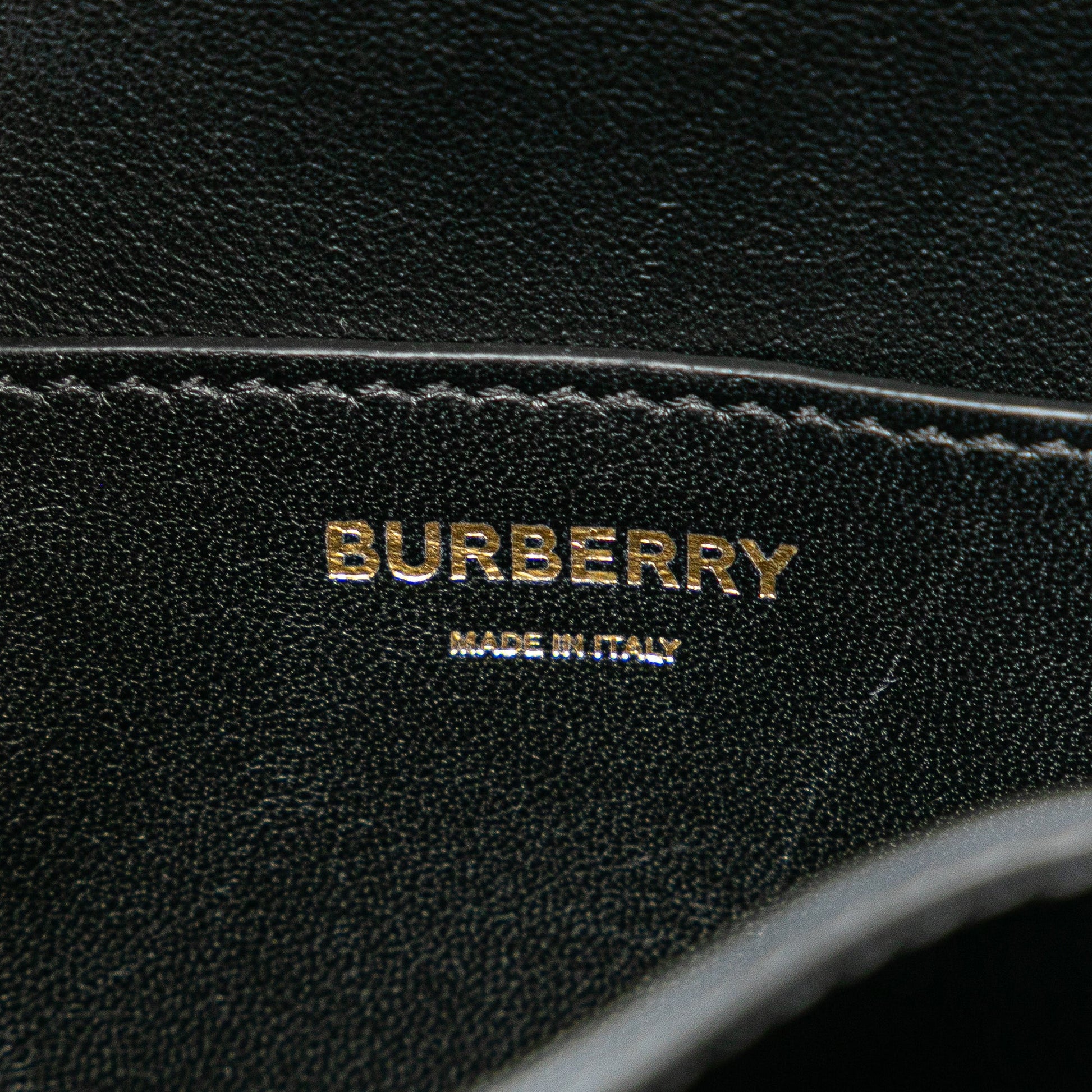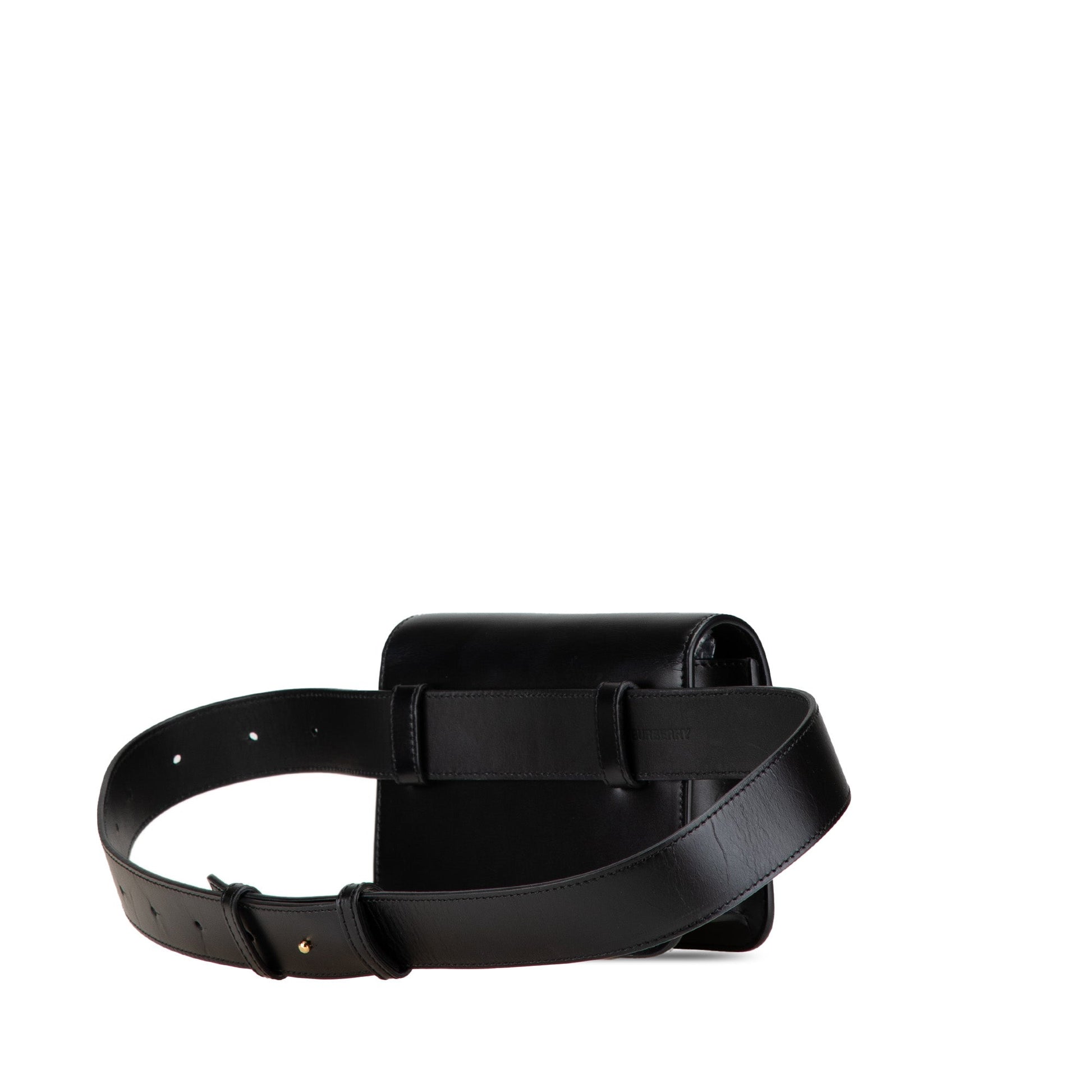 Product Details: Black Burberry Leather TB Belt Bag. This belt bag features a leather body, a flat leather waist strap, a top flap with a push lock closure, and interior zip and slip pockets. 4.7" L x 6.5" W x 2.2" D.