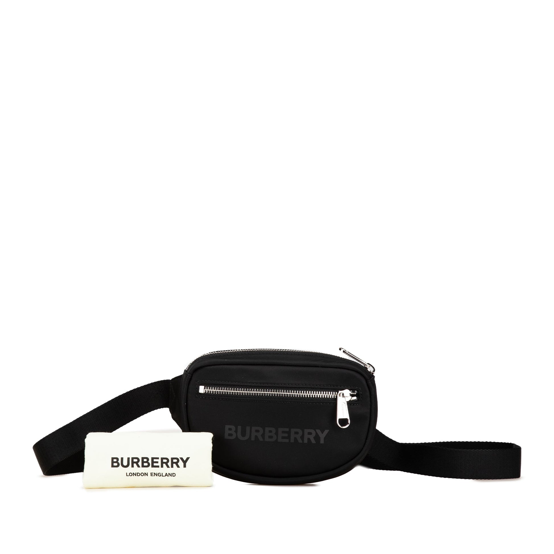 Product Details: Black Burberry Nylon Belt Bag. This belt bag features a nylon body, an adjustable flat waist strap, a top zip closure, and an exterior front zip pocket. 4.3" L x 7.1" W x 1.4" D. Serial number CNSUPLEA5DON.