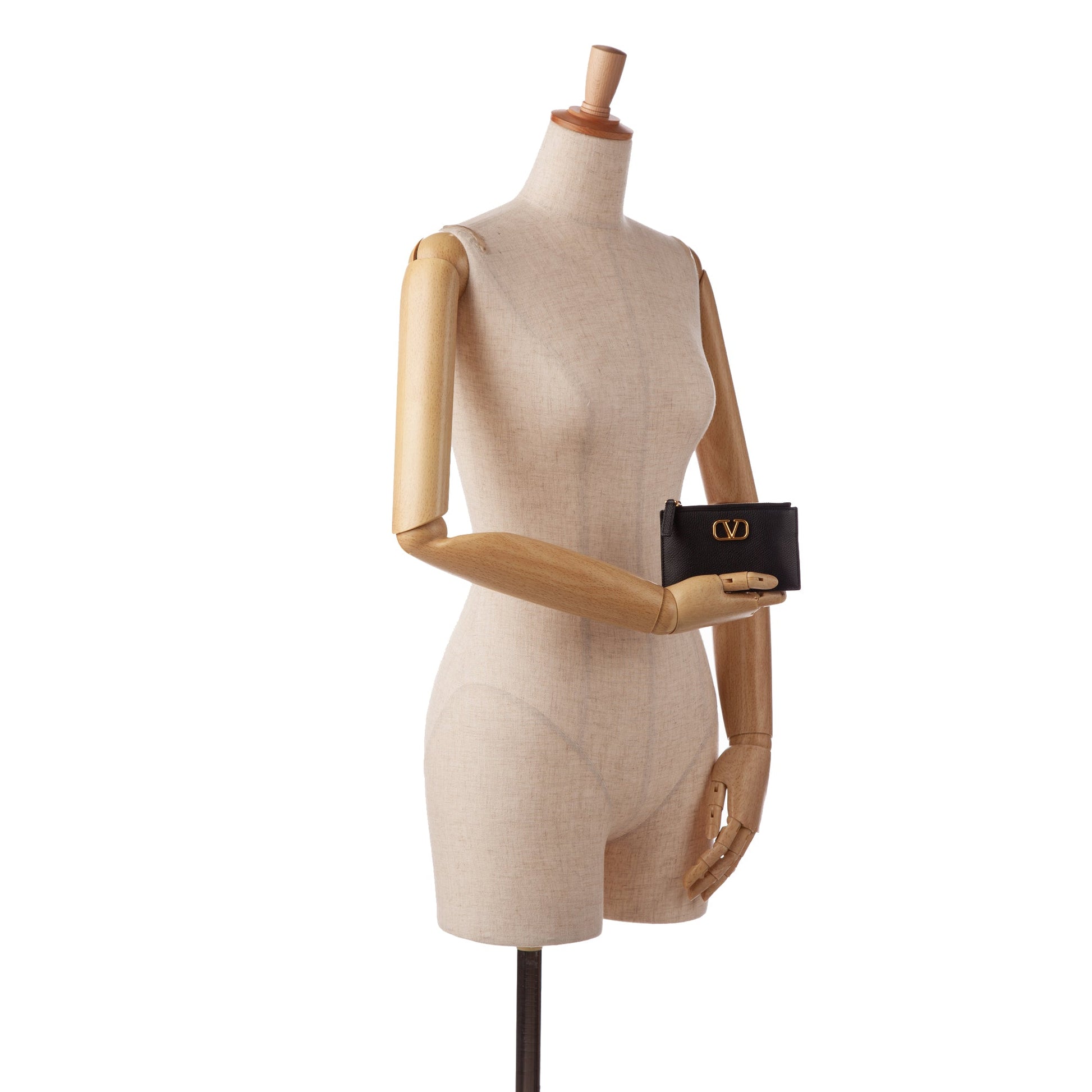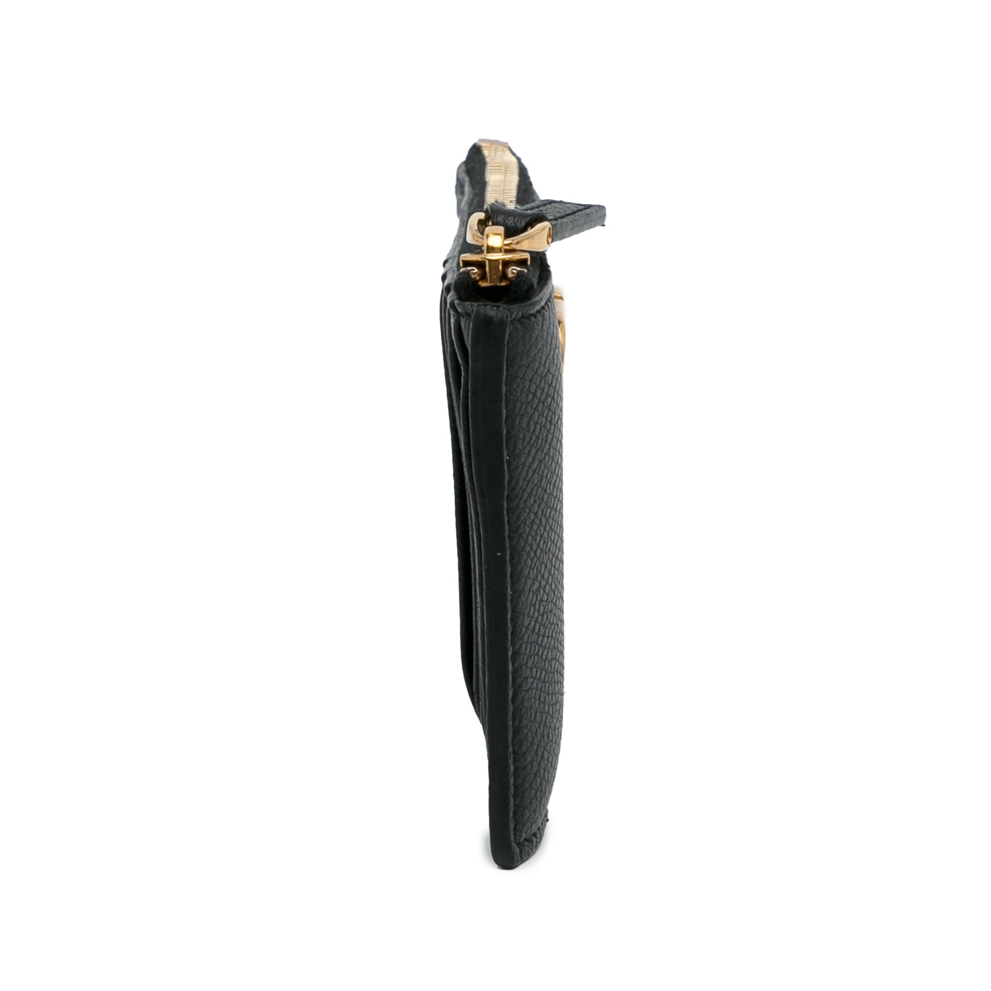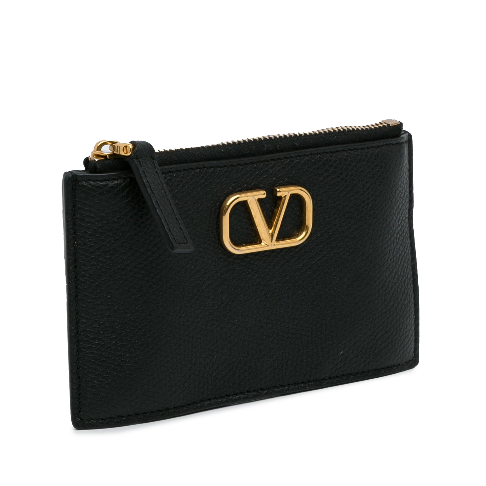 Product Details: Black Valentino Leather Cardholder Card Holder. This card holder features a leather body, exterior slip pockets, and a top zip closure. 3.3" L x 5.1" W x 0.4" D.