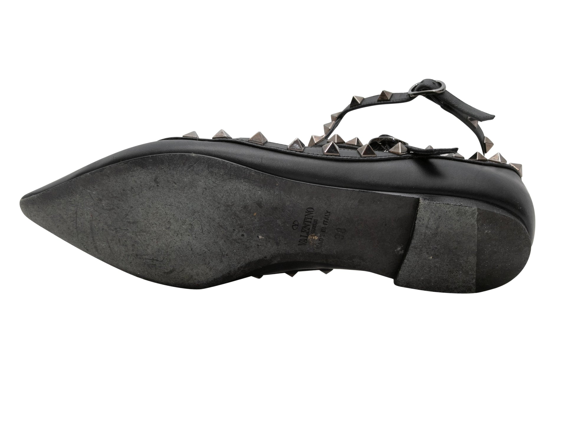 Product Details: Black leather pointed-toe gladiator ballet flats by Valentino. Gunmetal Rockstud trim throughout. Buckle closures at ankle straps. 2.5" shaft height.