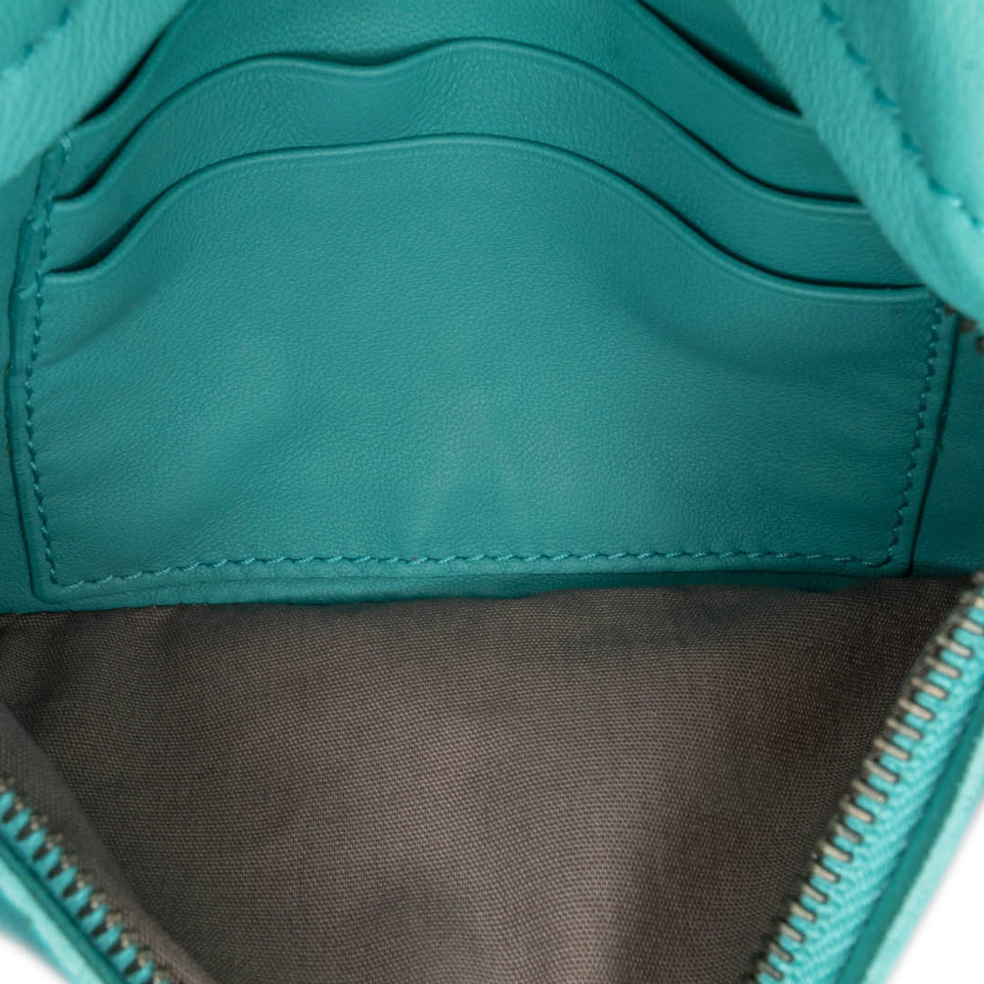 Product Details: Blue Bottega Veneta Intrecciato Chain Flap Crossbody. This crossbody bag features a woven leather body, a chain strap, a front flap closure, an exterior bottom zip compartment, and interior slip pockets. Exterior front has been repainted. 5.5" L x 8.3" W x 2.4" D. Serial number B069291191.