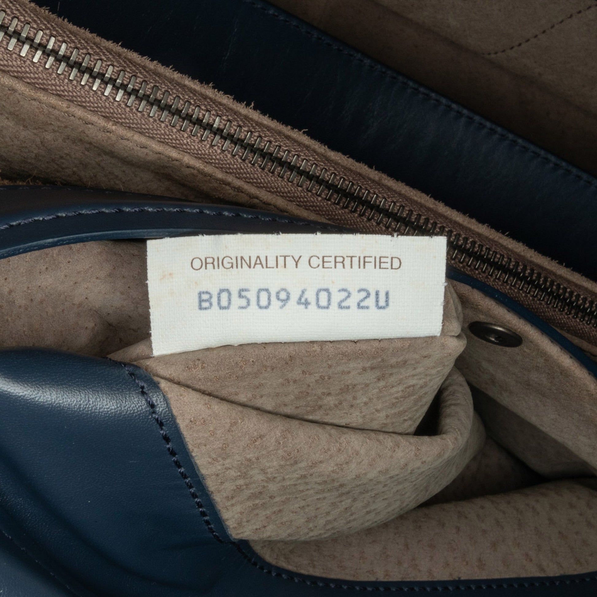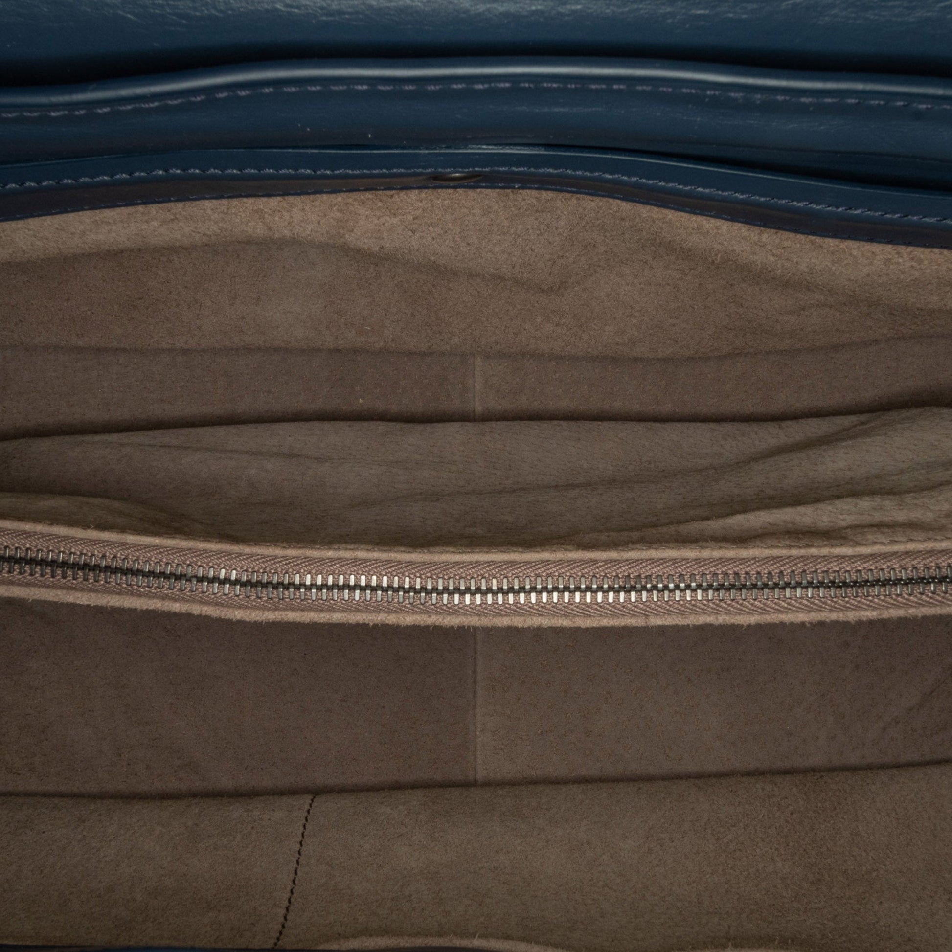 Product Details: Blue Bottega Veneta Intrecciato Satchel. This satchel features a leather body, a flat handle, a flat leather strap, a front flap, and interior zip and slip pockets. 6.7" L x 12.6" W x 5.9" D, 5.5" drop. Serial number B05094022U.