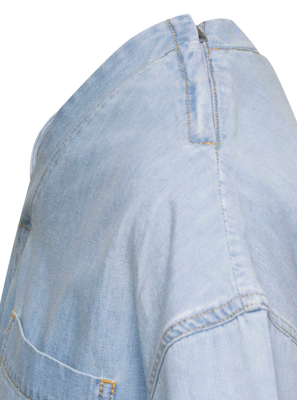 T-shirt V neckline Half sleeves One pocket at the front White trim Liningless Light blue Denim Oversize fit