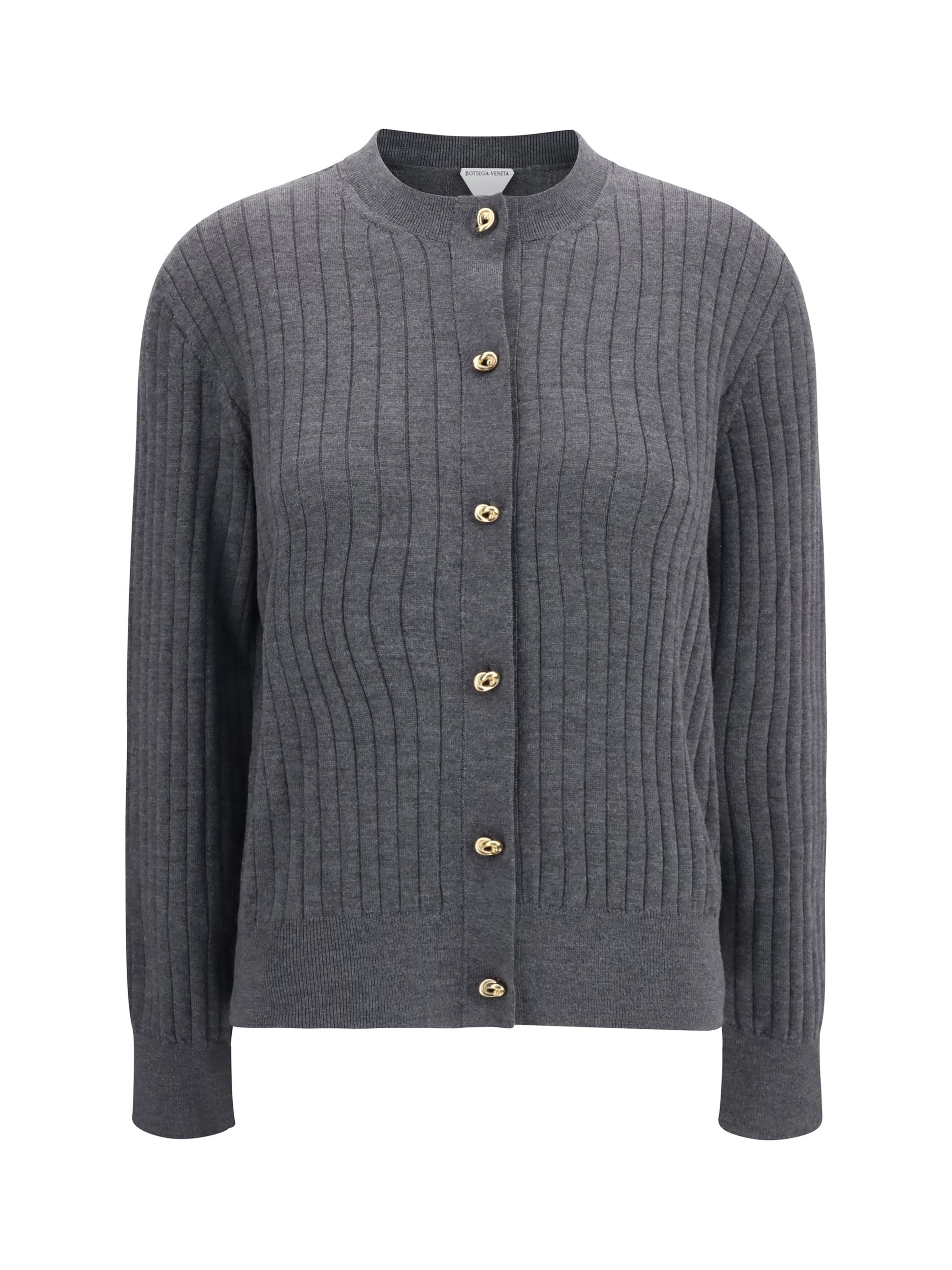 Bottega Veneta's wool Cardigan combines fine workmanship and iconic details in a piece with an essential style. The ribbed design is complemented by a ribbed crew neck, hem, and cuffs, while the front closure is enhanced by the house's signature metal knot buttons.