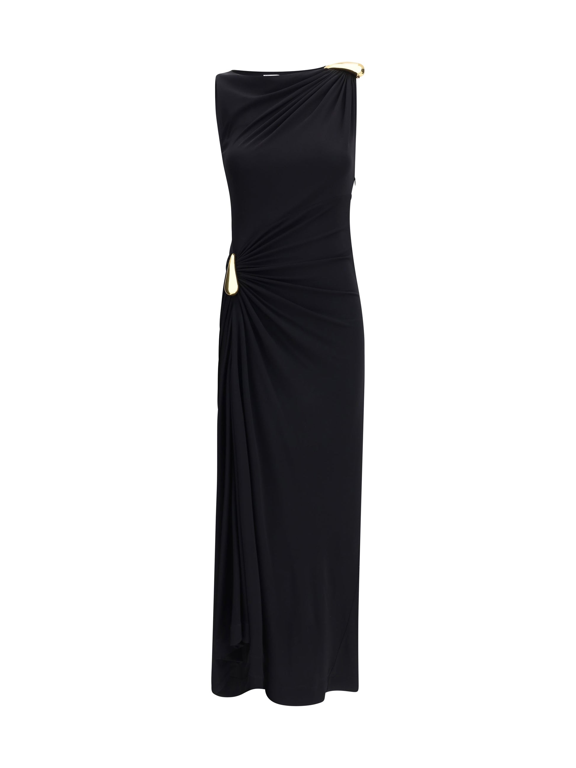 Bottega Veneta's Draped jersey Dress is a sophisticated and modern garment defined by an elegant drape enhanced by metallic details on the side and top. Featuring a round neckline and a concealed zipper closure at the hip, it is made without lining for a light, fitted fit that enhances the silhouette with essential style.