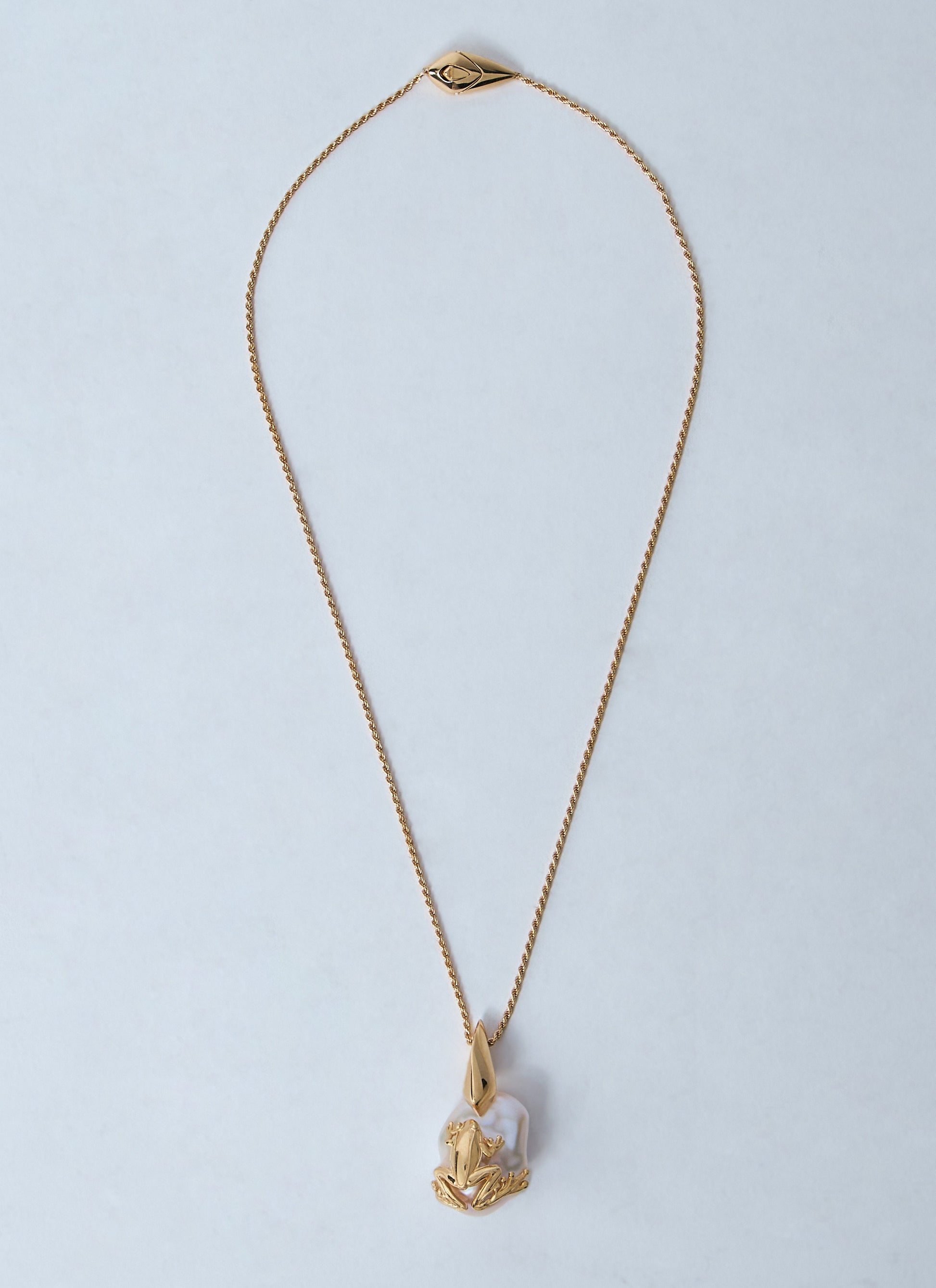 Necklace in 18k gold-finished sterling silver with baroque pearl pendant and frog detailing.