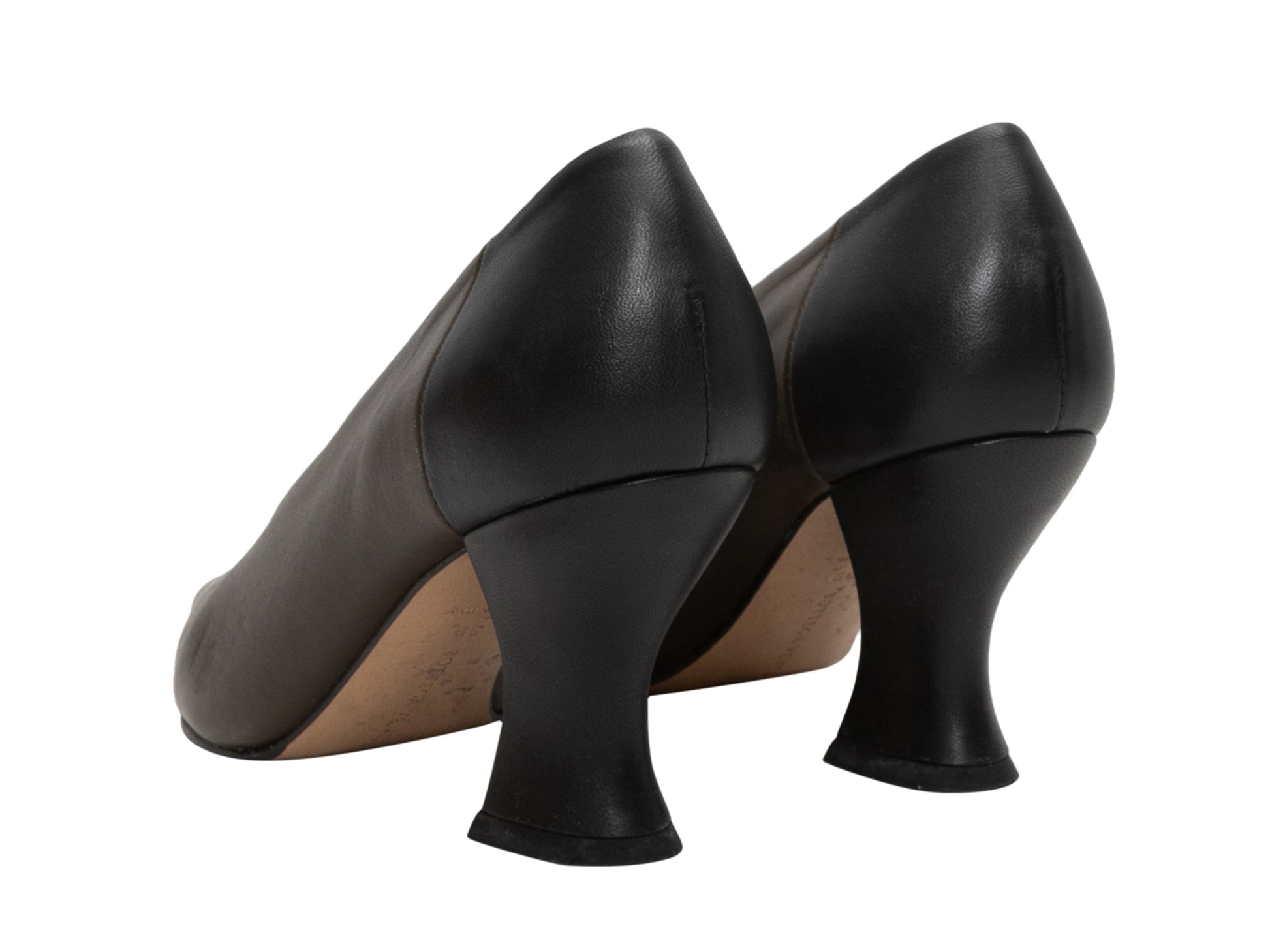 Product Details: Brown and black leather pointed-toe pumps by Bottega Veneta. Block heels. 3.5" heel height.
