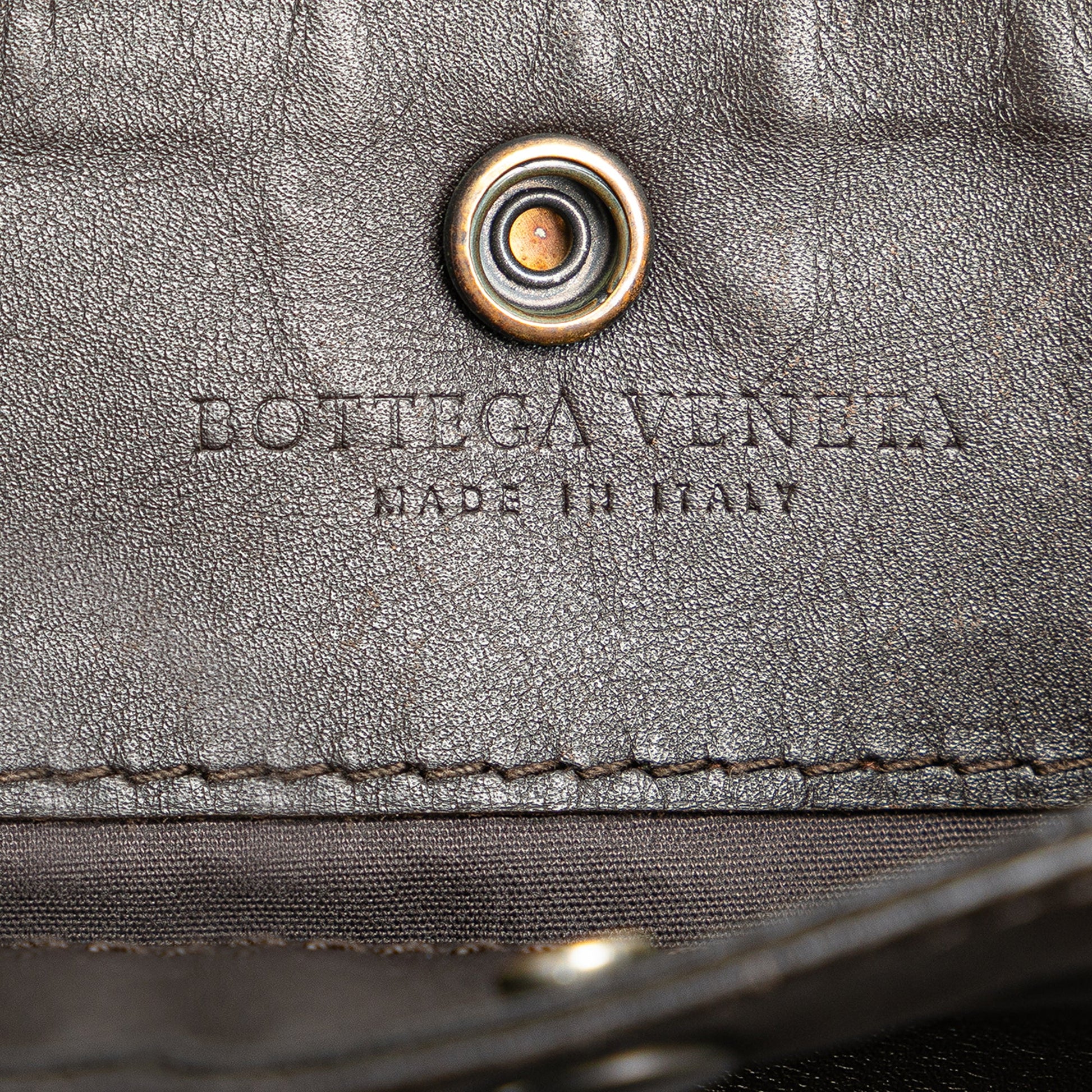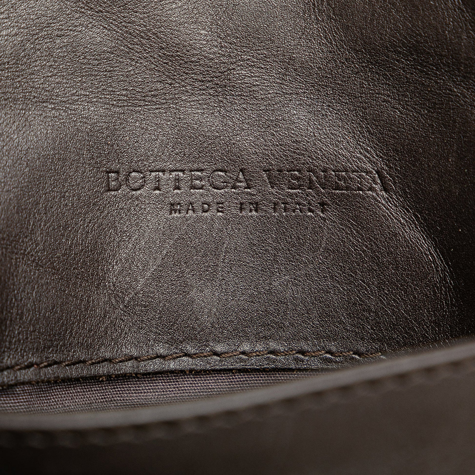 Product Details: Brown Bottega Veneta Leather Intrecciato Crossbody. This crossbody bag features a leather body, an adjustable flat shoulder strap, an open top with snap closure, and a detachable exterior front flap pocket. 9.4" L x 10" W x 0.4" D. Serial number 273350.