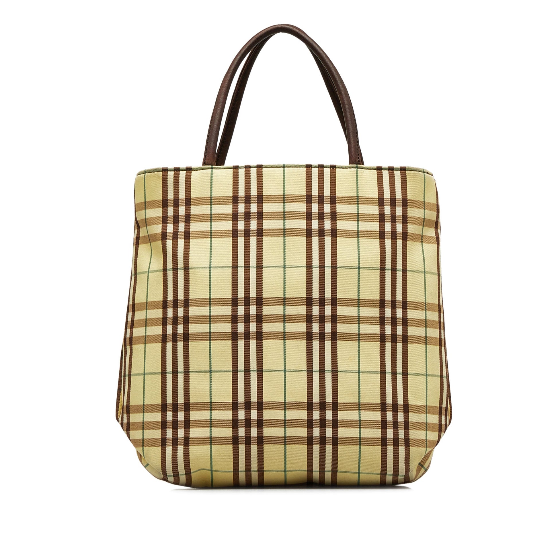 Product Details: Brown Burberry House Check Handbag. This handbag features a canvas body, flat leather handles, an open top with magnetic closure, and an interior zip pocket. 9.3" L x 8.1" W x 3.1" D, 3.9" drop.