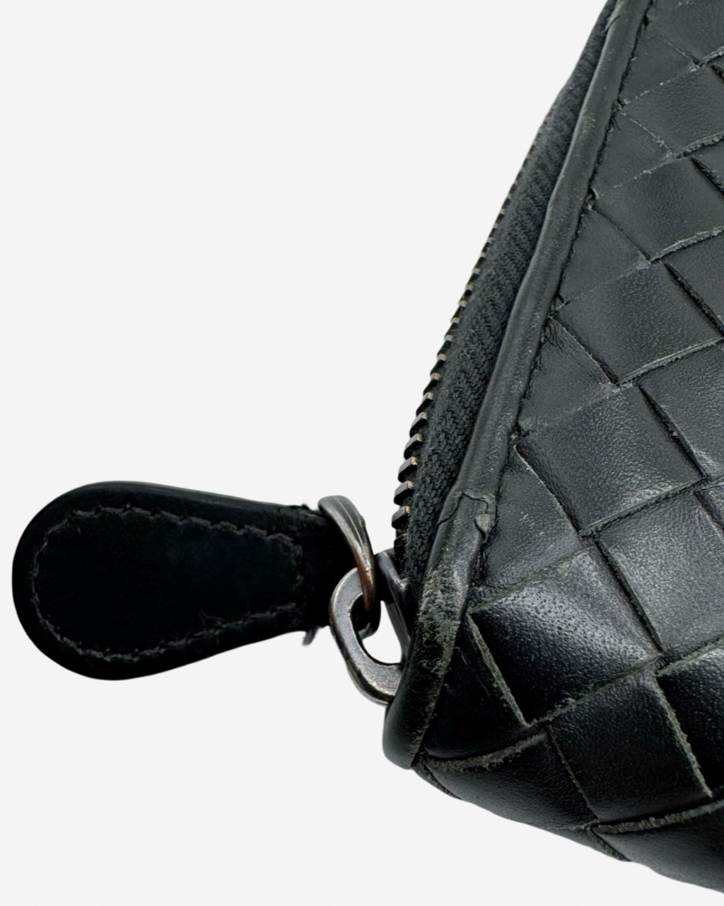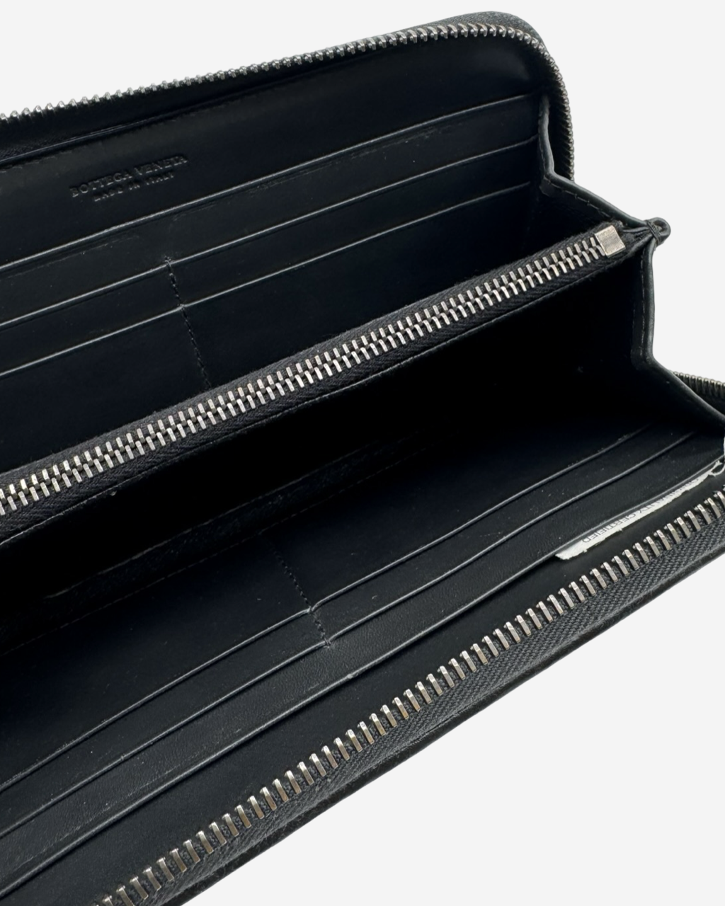 - Descripción: Cartera en color negro en motivo intrecciato, compartimento para tarjetas y billetes, hardware color plateado