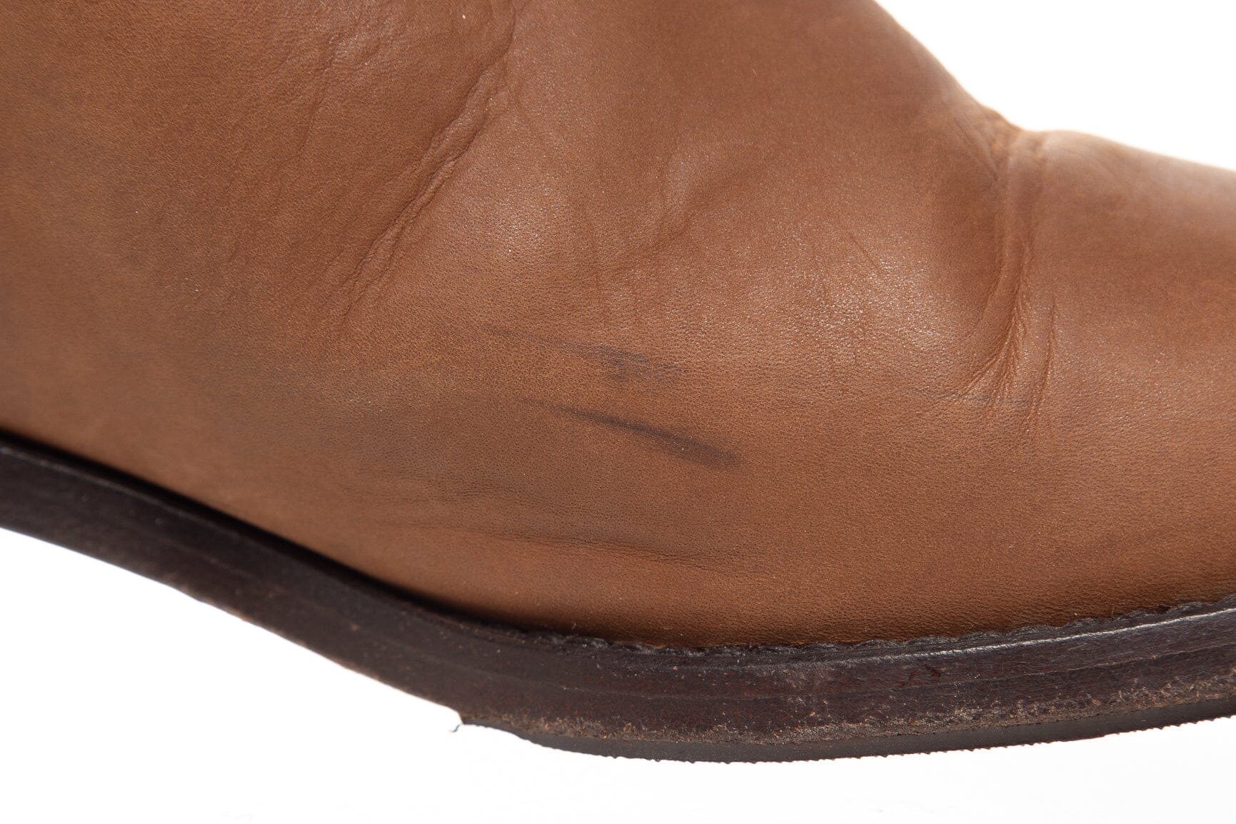 Chanel Brown Leather Knee High Riding Boots w/Interlocking CC. This item is in good condition; some scratching and discoloration on leather.