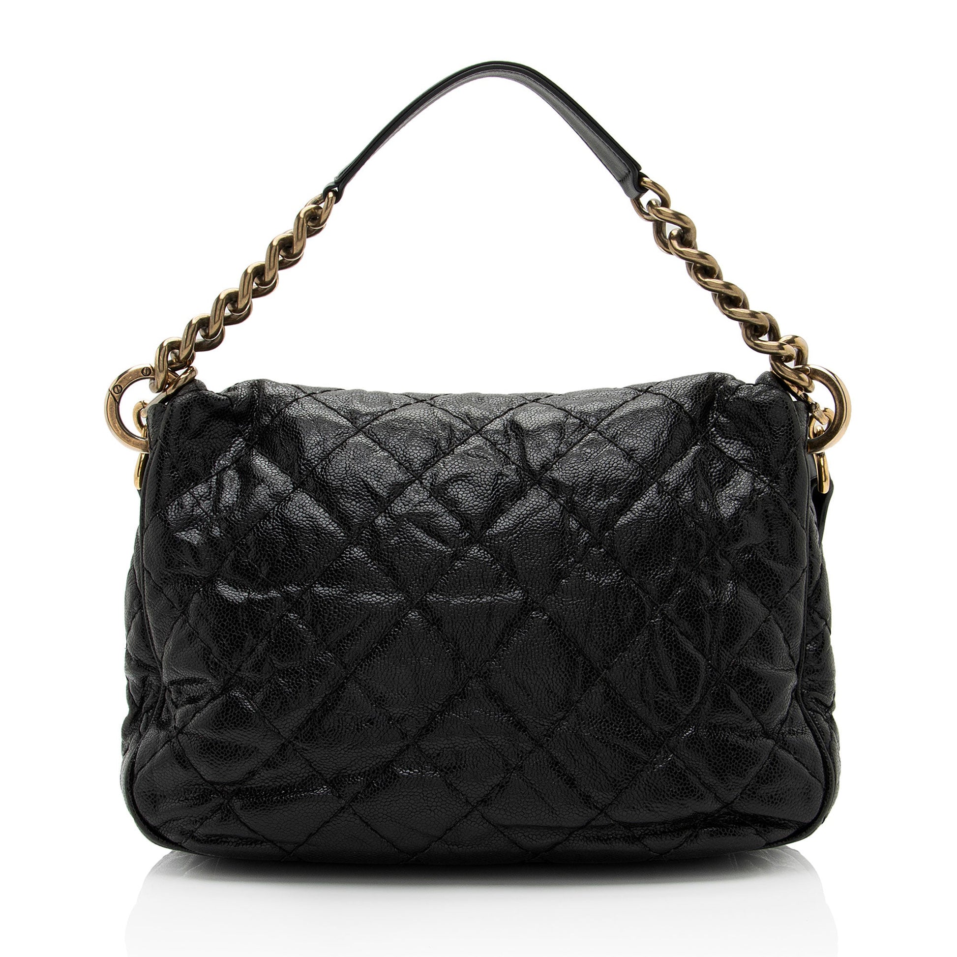 Condition Notes: Visible creasing and scuffs throughout exterior. Visible scuffs to exterior bottom corners. Light scuffs and creasing throughout shoulder strap. Surface scratches and light tarnishing to hardware. Scuffs throughout interior. Light marks and wear throughout interior.