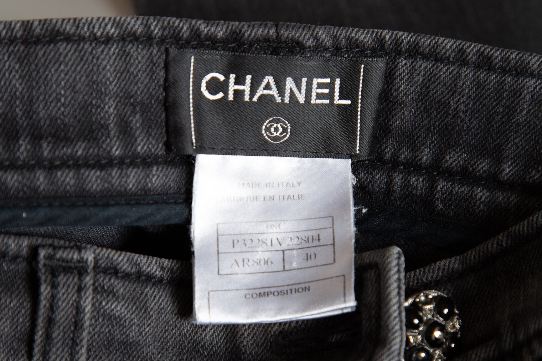 Chanel Grey Straight Leg Jeans w/Gem Button. This item is in very good condition.