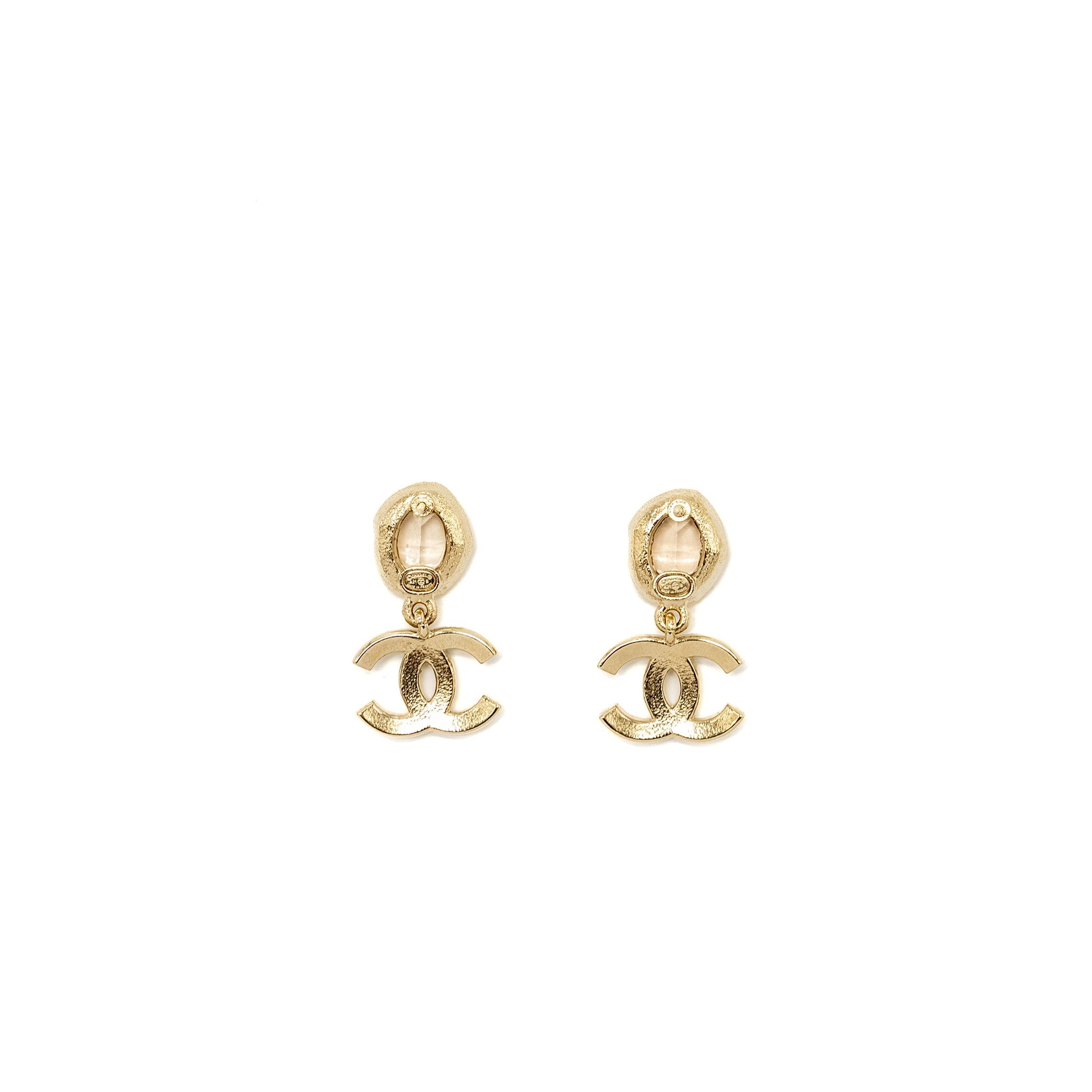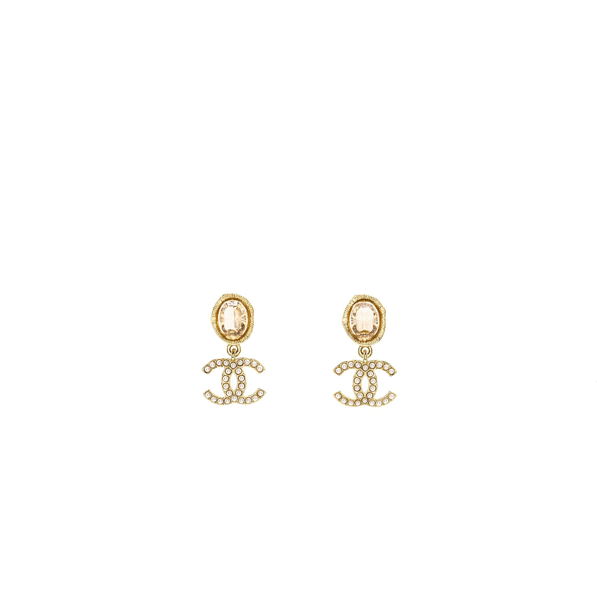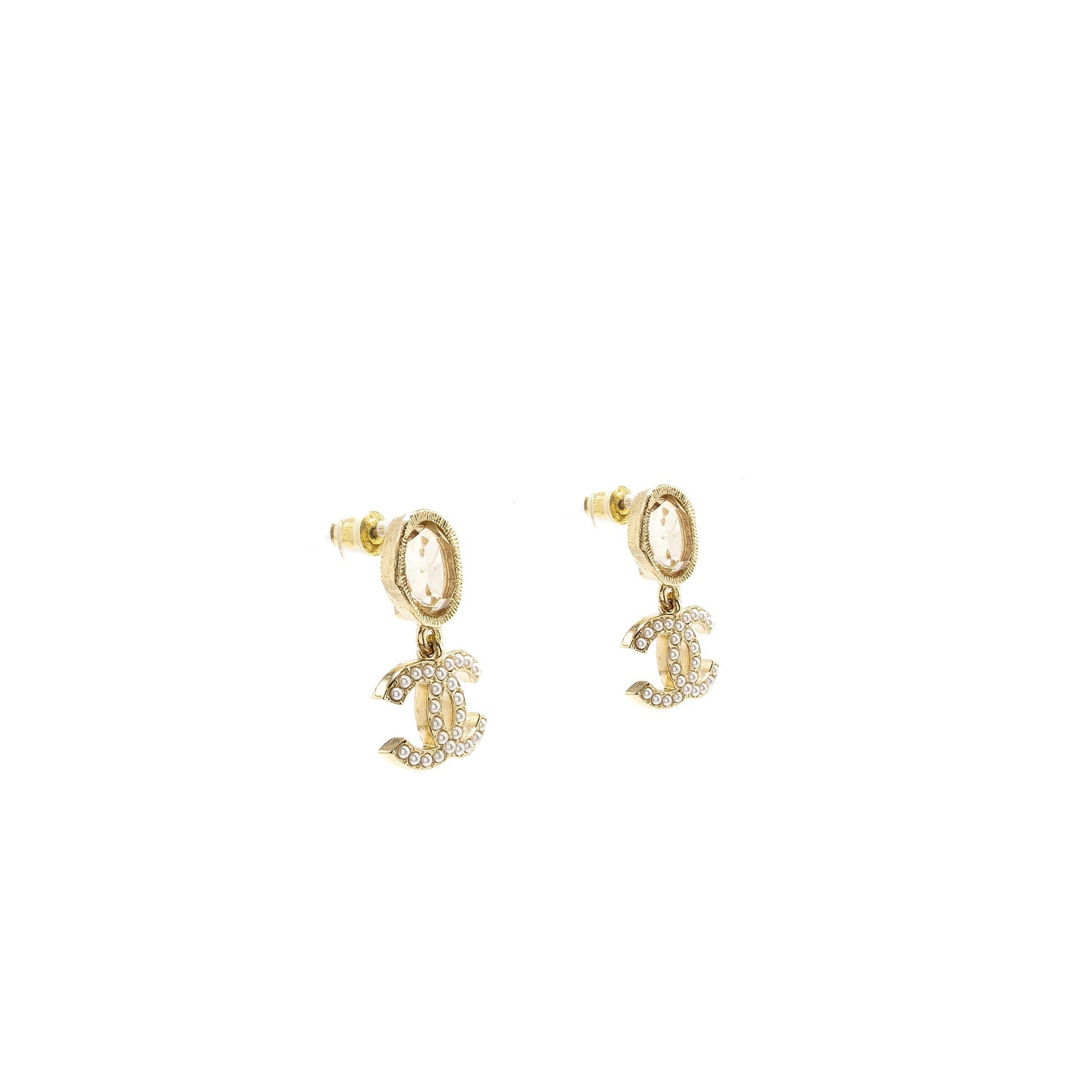 CHANEL Pearl CC Logo Drop Earrings Crystal Light Gold Tone