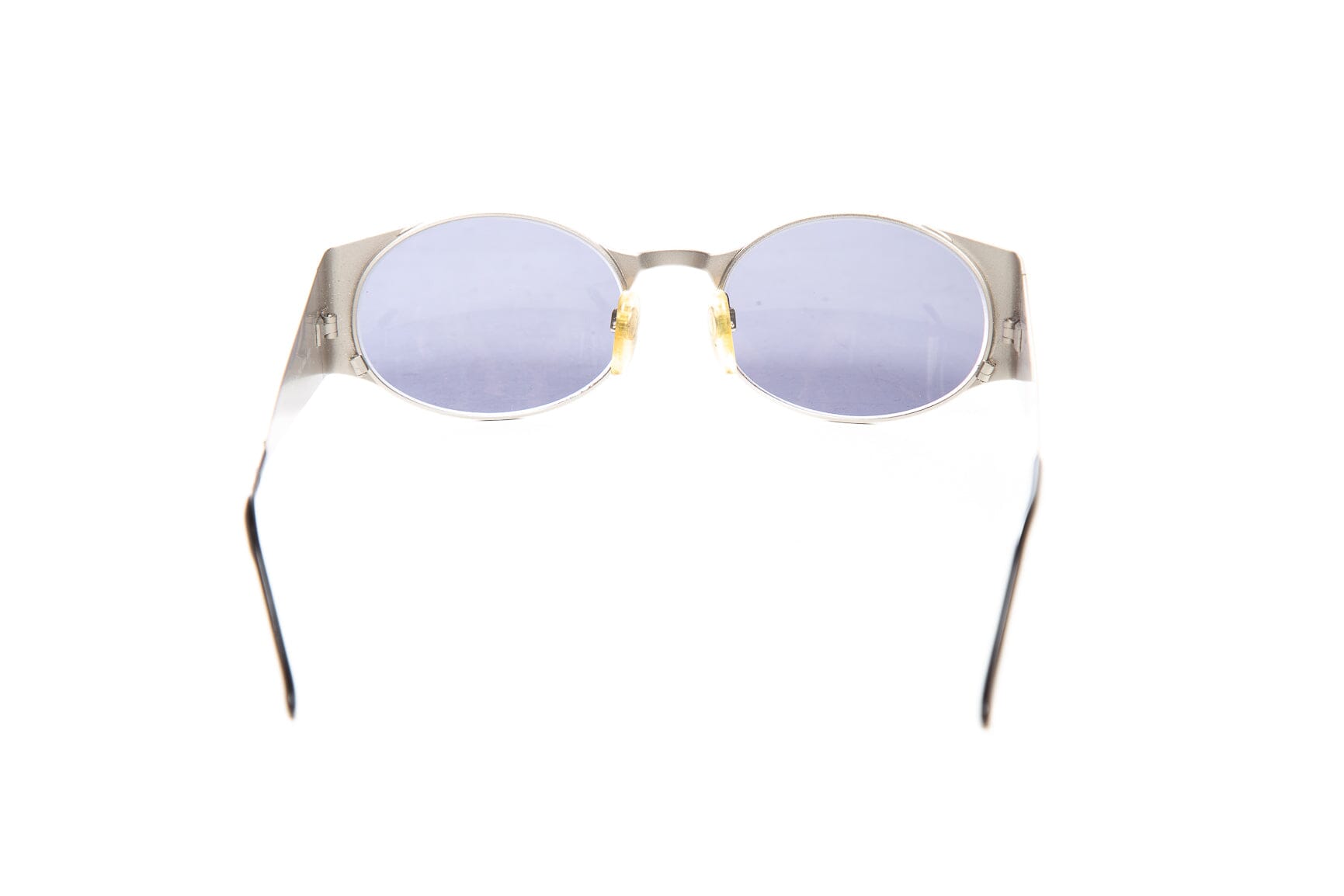Chanel Silver Oval w/Purple Lens Sunglasses. This item is in good condition; some scratching on lenses.