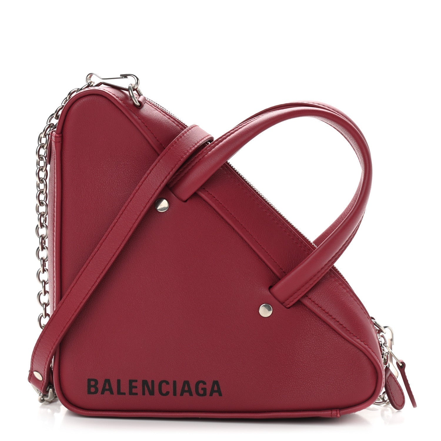 This handbag from Balenciaga is constructed with a soft dark pink calfskin leather. Its structured triangle silhouette is topped off with a black Balenciaga logo on the front. It features a detachable silver-tone chain strap with a leather shoulder pad for comfort. The two-way zipper closure opens up to a black leather lined interior with a zipper pocket and card slots.Β This is a chic bag that is perfect for everyday use, with a one of a kind look from Balenciaga!