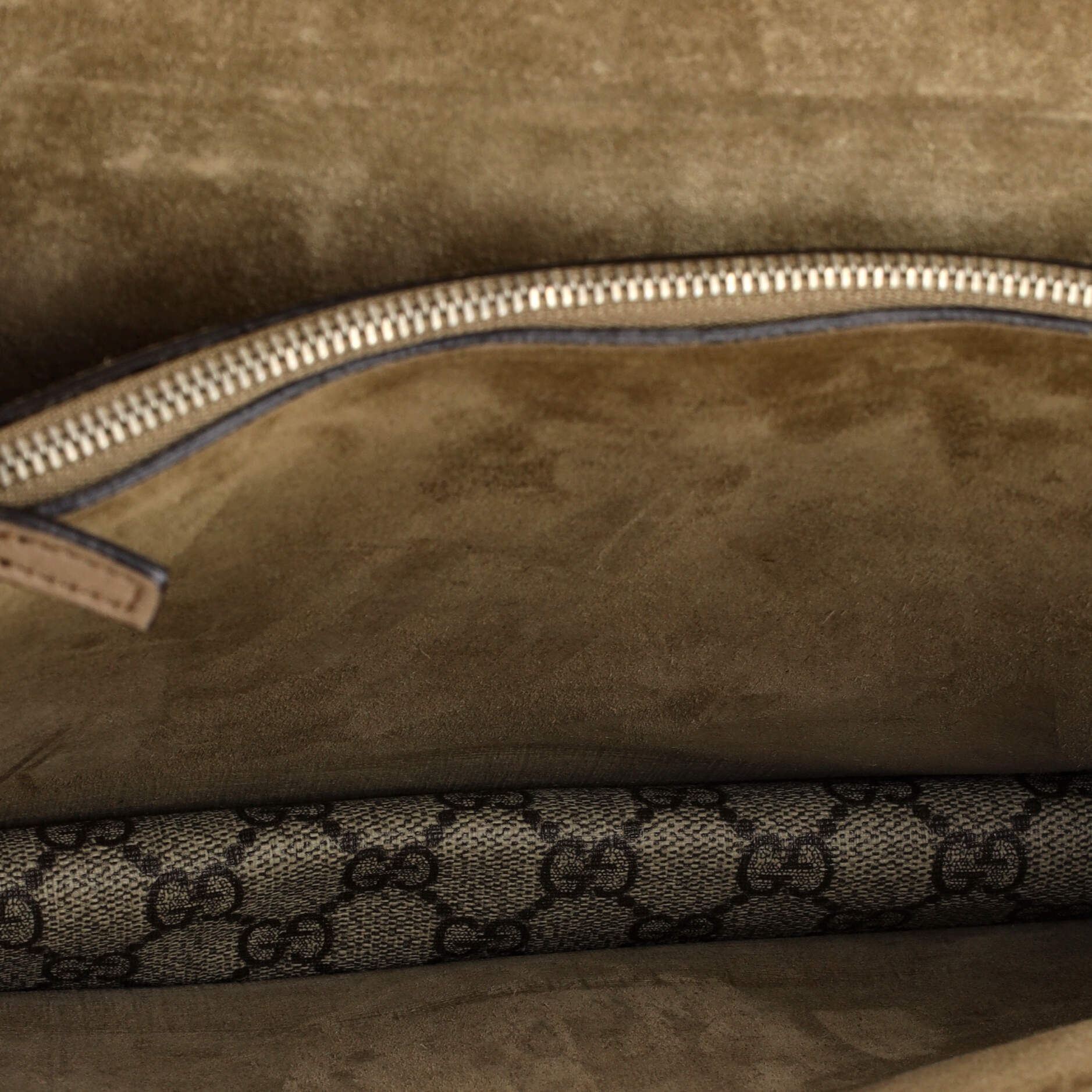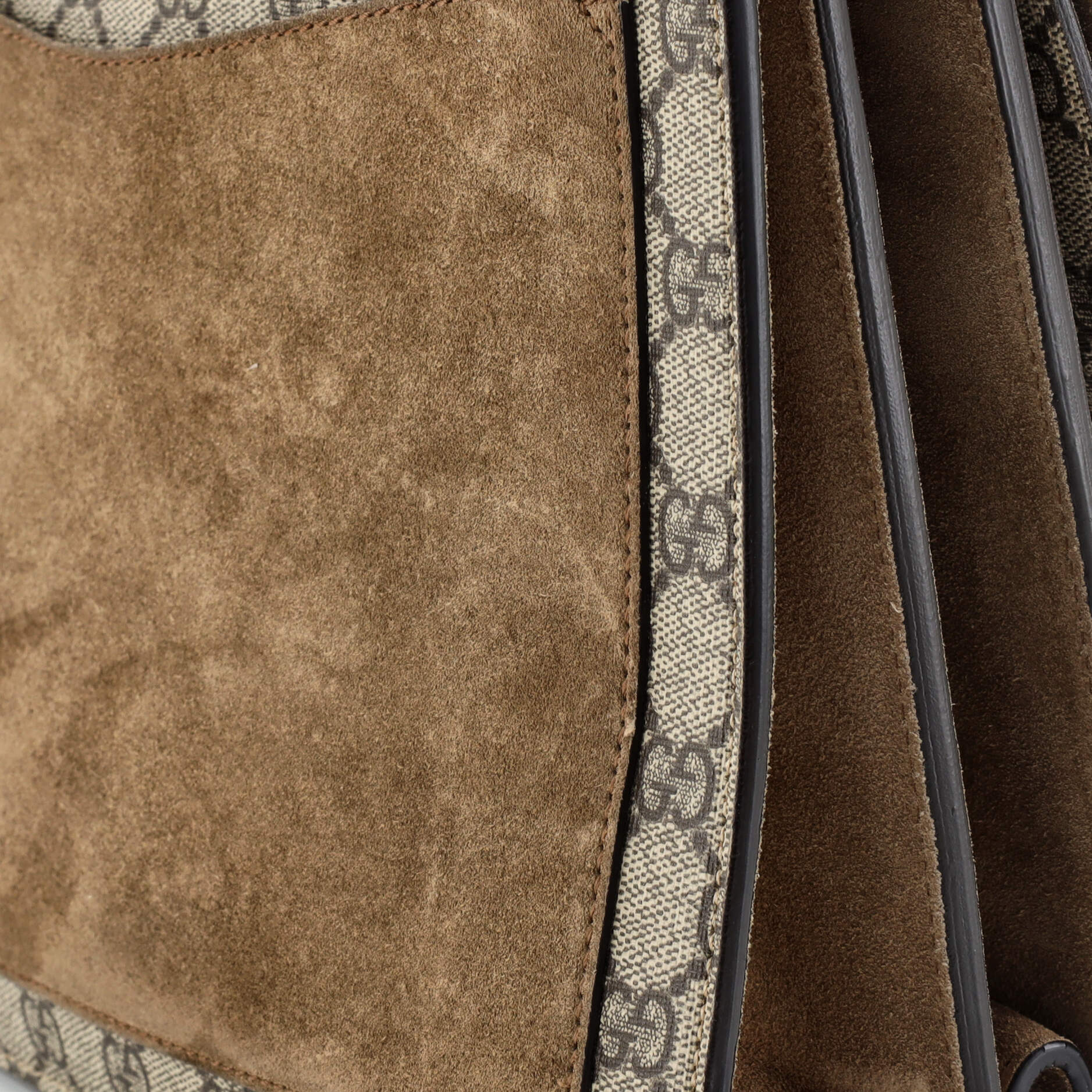 Condition - Very good. Moderate wear and darkening on suede trims, underneath flap and in interior, glue stains on closure trim. Cracking on side opening wax edges, scratches on hardware.