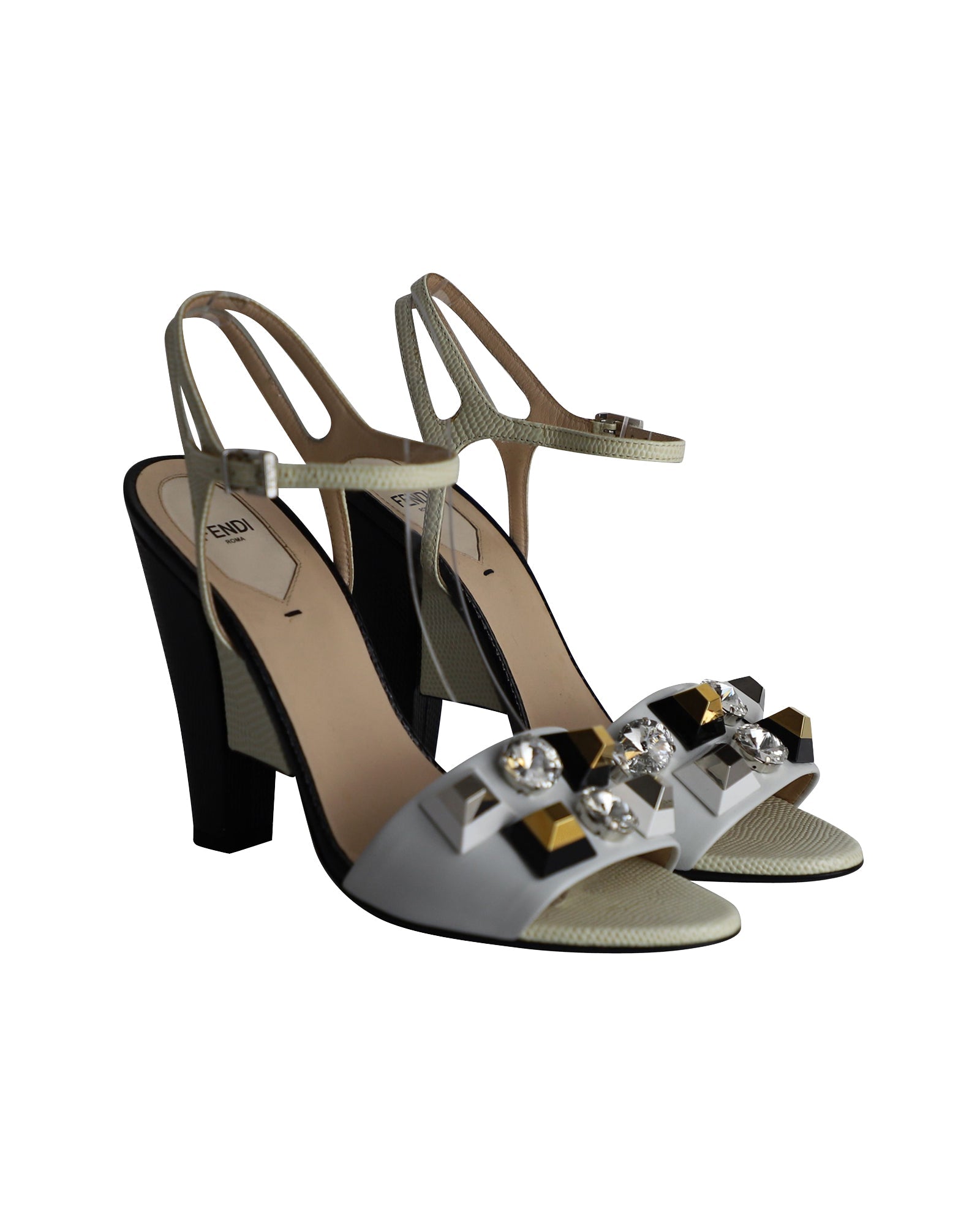 These Fendi sandals will sweep you off your feet with their extravagant embellishment and luxurious style. The chunky silver and gold-tipped pyramid studs and crystals adorn the single toe strap and fastened with an adjustable ankle strap. It features high block heels made from lizard-print leather and an open toe design. These shoes will add glamour and refinement to any look you create.Fendi Crystal Embellished Open Toe Sandals in White LeatherCondition - New with dust bagSign of wear - Very light wear on the solesMaterial - LeatherColor - White and ivorySize - EU39.5 / UK6.5 / US9.5SKU - 283004
