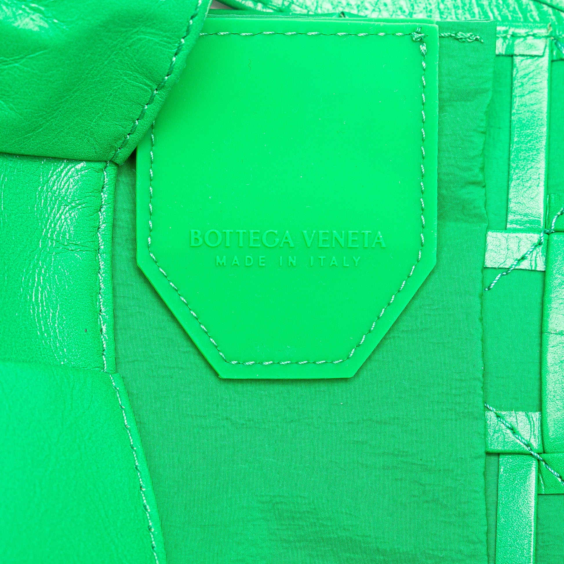 Product Details: Green Bottega Veneta Small Nappa Intrecciato Cassette Crossbody. The Cassette features a woven nappa leather body, a flat leather shoulder strap, and a front flap closure. 4.3" L x 7.1" W x 1.6" D. Serial number A00045479B.