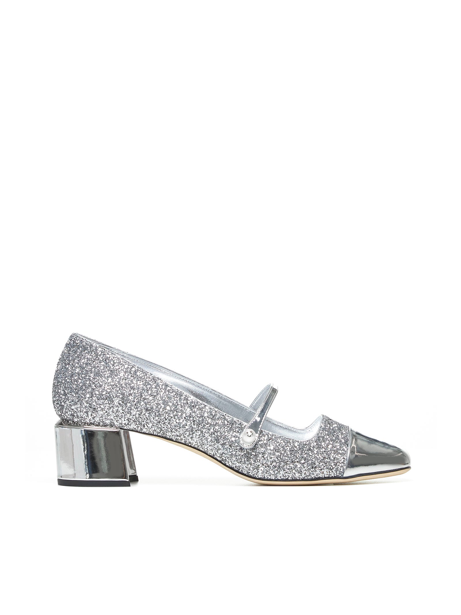 Jimmy Choo's Elisa silver-tone glitter fabric and patent leather pumps featuring a pointed toe, front strap with pearl logo, leather lining, insole and sole and slightly slanted block midi heel.