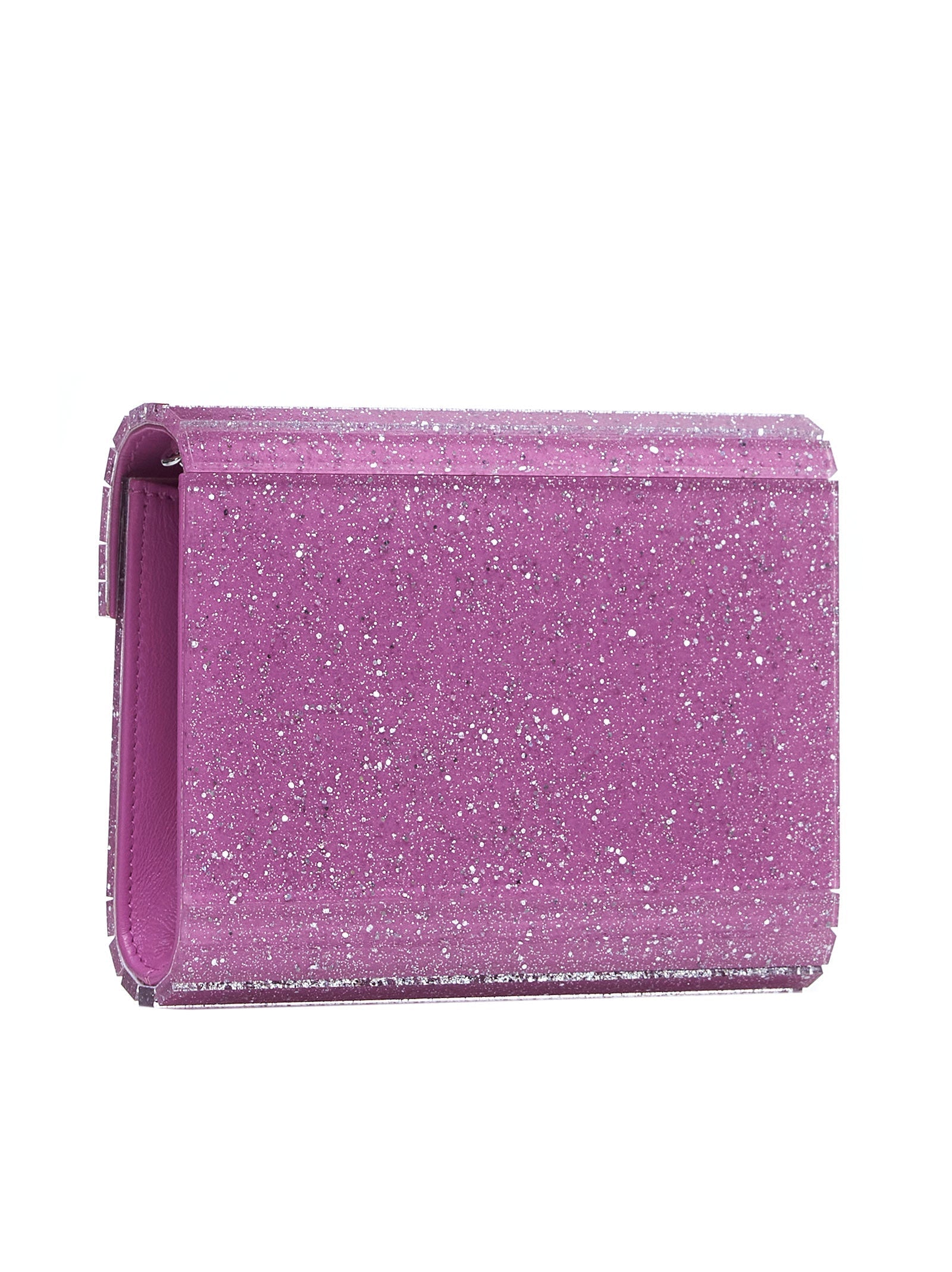 •Asymmetrical foldover-top with magnetic fastening •Metal chain shoulder strap •Silver logo at flap •One main compartment, one flat pocket with Jimmy Choo engraved tag; satin lining •Glitter-finish acrylic design with ribbed inserts •Light magenta color •100% Acrylic •Made in Italy
